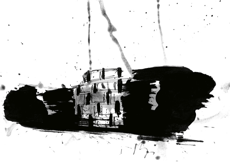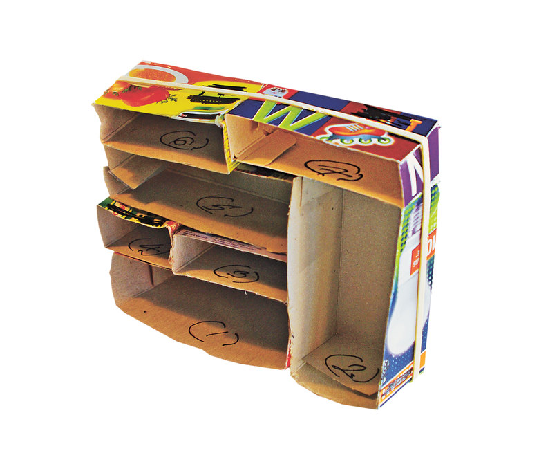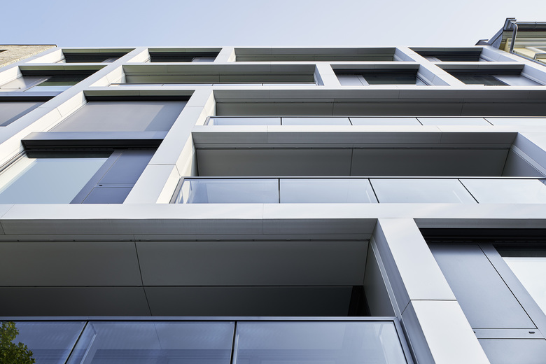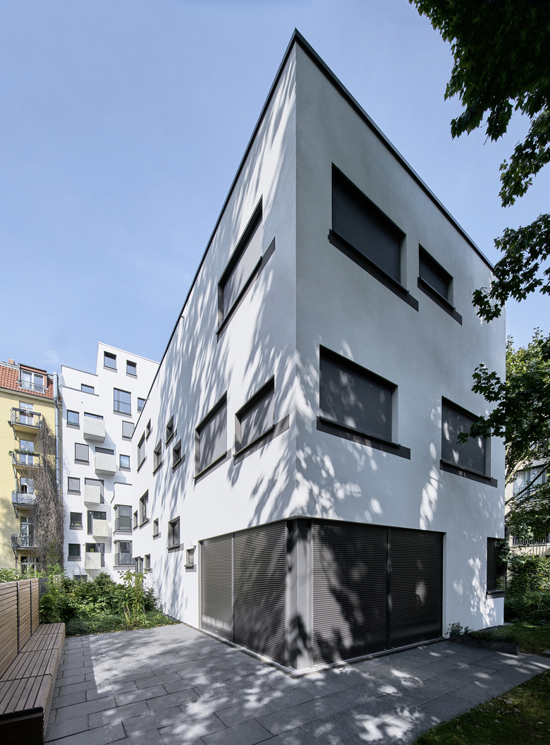 Die vordere, nach Nordwesten weisende Fassade nimmt, aufgrund ihres Wechsels waagrechter und senkrechter Linien, Bezug auf die Fassade des Neubaus zur Linken; auch bietet sie die Struktur eines Regals. Die Tiefgarage hat Platz für 10 Autos.