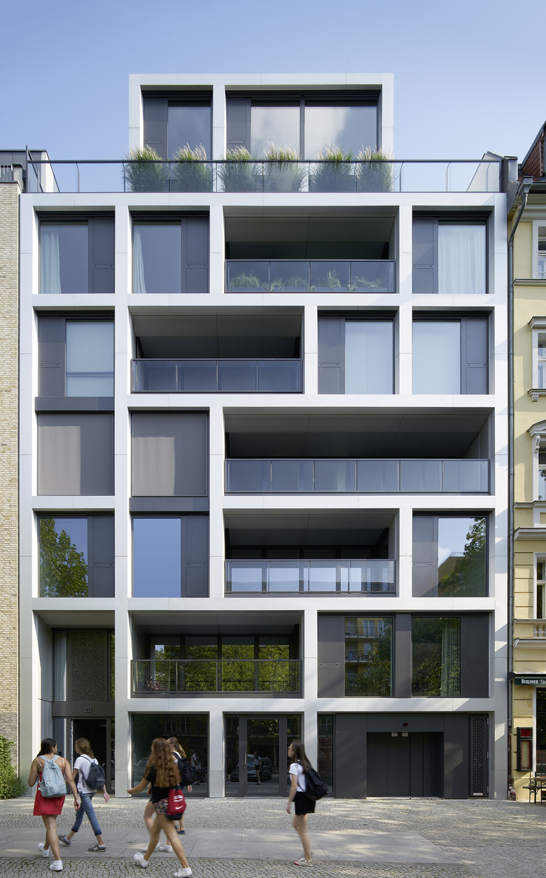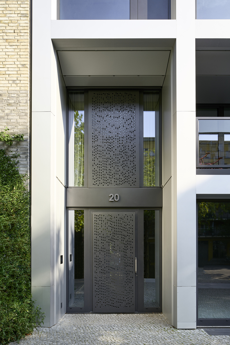 In den 8 Geschossen über Niveau finden sich 6 Wohnungen – zum Teil als Maisonette-, zum Teil als Etagenwohnung konzipiert – mit Flächen zwischen gut 120 und gut 180 Quadratmetern. Die beiden obersten Geschosse liegen über der Traufkante und sind nach der Art eines Penthauses gestaltet; davor erstreckt sich ein breiter Balkonstreifen. Ein Gartenhaus hinter dem Vorderhaus bietet 2 weitere Wohnungen.
