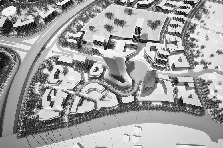 Entstanden in der Folge des Beitrages zum Wettbewerb Novelia Split, einem neuen Stadtteil auf einem Gelände von äußerster Zersiedlung, bilden die Projekte der Banka Splitska und dreier weiterer Hochhäuser – die alle um ein Rondell stehen und alle von niedrigen Gebäuden begleitet werden – den Abschluss einer großen West-Ost-Achse. So leicht es auch fällt, die räumliche und bauliche Anlage von Achse und Rondell das »La Défense« von Split zu nennen, so klar ist doch, dass hier keine reine Büronutzung im Entstehen begriffen ist, sondern Mischung und Dichte erreicht werden sollen.