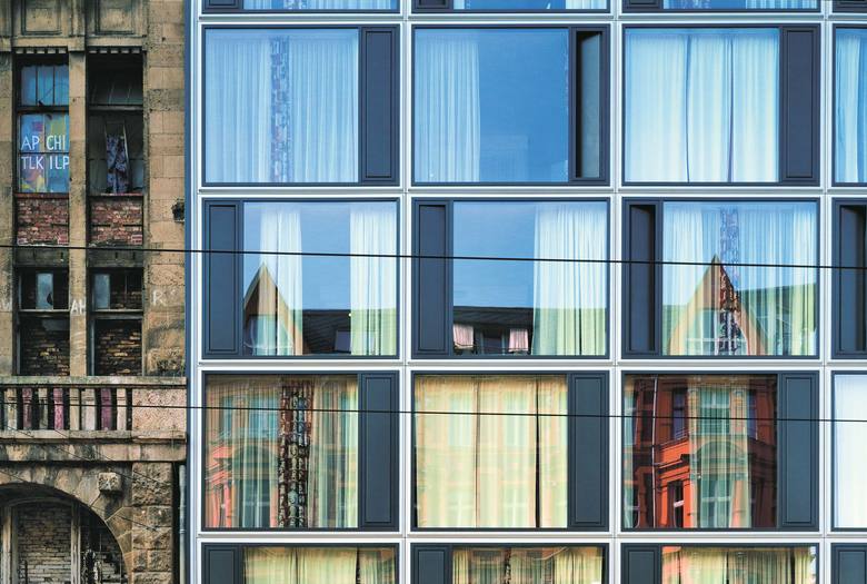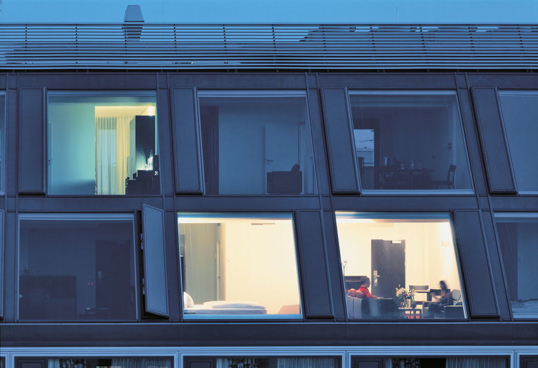 Die gläserne Stirnseite, das heißt die Fassade, macht den Gast einerseits zum Voyeur, anderseits zum Objekt des Alltags an der Mündung von Oranienburger Straße und Linienstraße. Pro Hotelzimmer erscheint eine feste Scheibe von 2,7 mal 2,7 Metern, neben ihr eine öffenbare Klappe von 0,5 Metern Breite. Die Öffnungsflügel sind, wie die Rahmen der Fenster, aus Aluminium; doch sind sie mit einer matten, anthrazitfarbenen Schicht versehen. Und sie springen – sowohl von Geschoss zu Geschoss als auch von Zimmer zu Zimmer – immer wieder von rechts nach links, von links nach rechts.