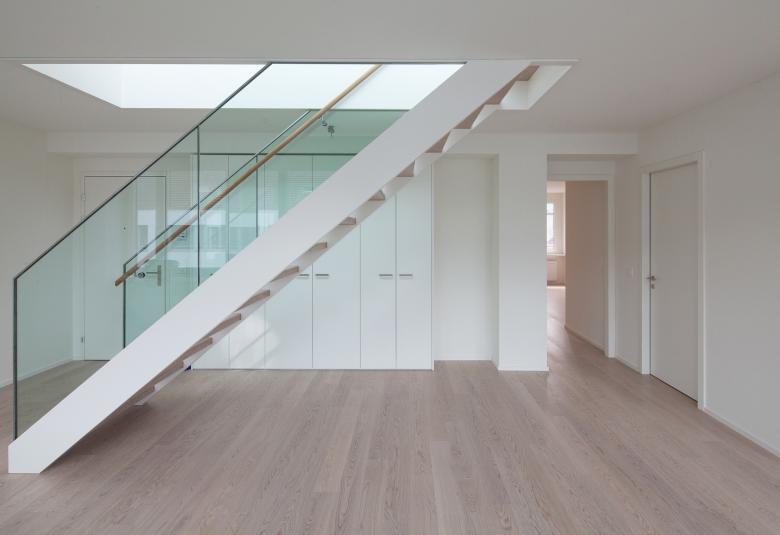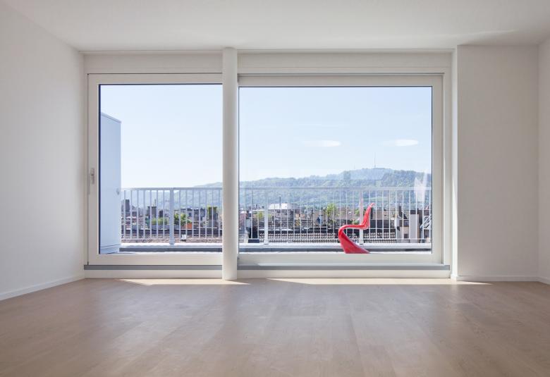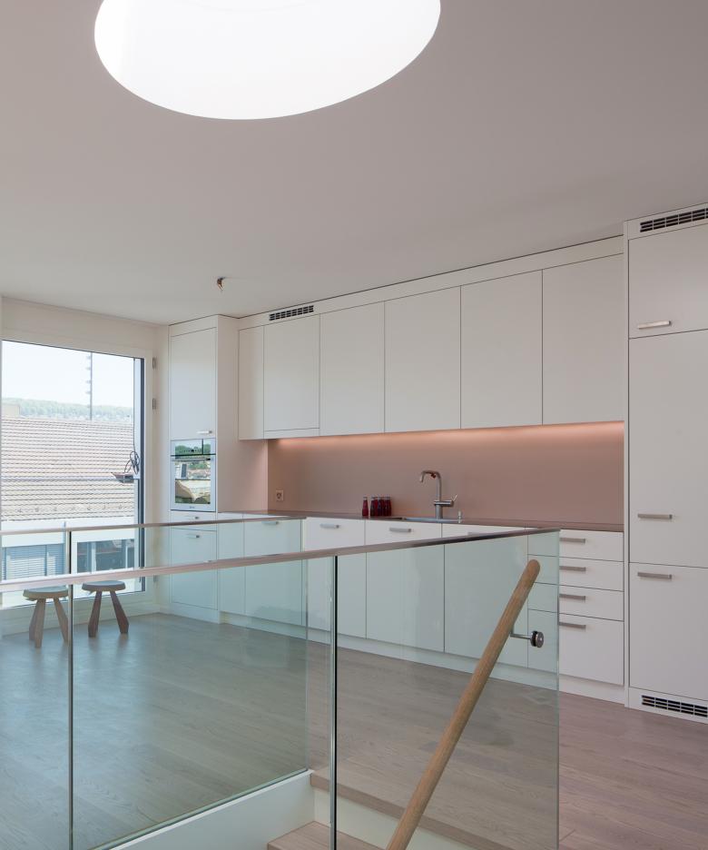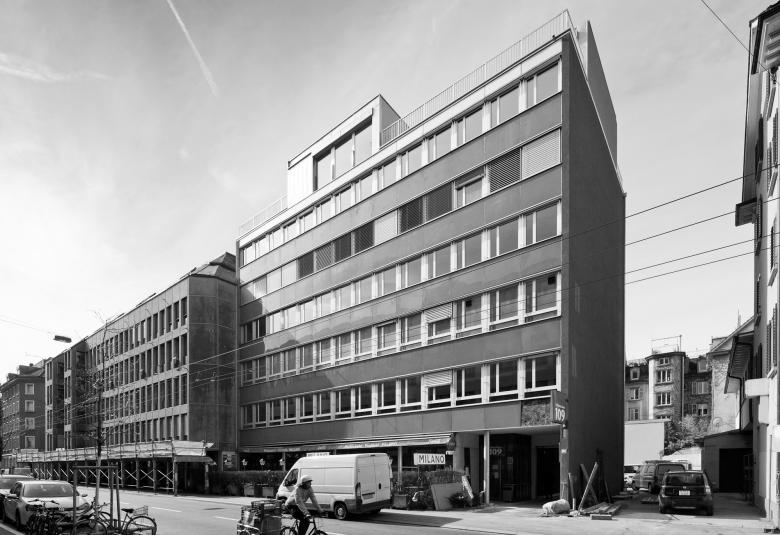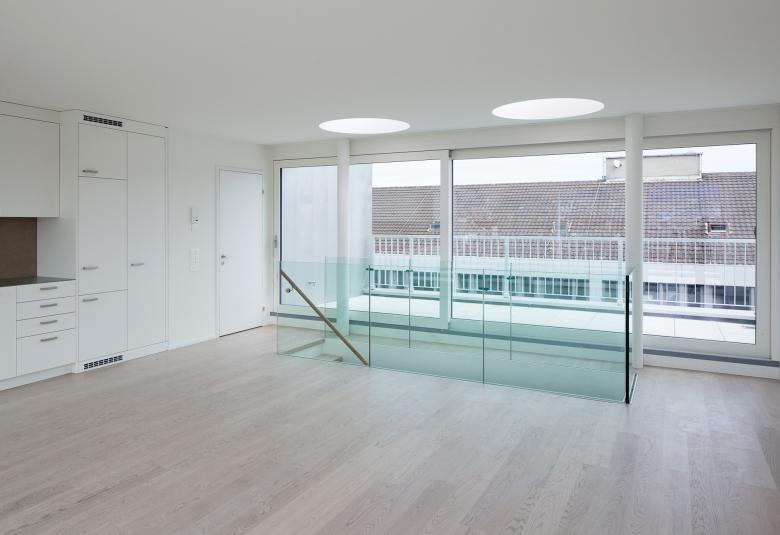 Die Liegenschaft an der Militärstrasse wurde 1964 gebaut und vorwiegend als Geschäftshaus genutzt. Die Potentialanalyse zeigte, dass das 6- geschossige Gebäude um ein zusätzliches Geschoss aufgestockt werden konnte. Zur besseren sozialen Durchmischung der Liegenschaft war darin zusätzlicher Wohnraum gewünscht. Das Konzept der Aufstockung beinhaltete das Zusammenlegen mit dem obersten Bürogeschoss zu zweigeschossigen Penthouse-Wohnungen. Dadurch konnte das bestehenden Treppenhaus mit Lift unverändert belassen werden. Die einläufigen inneren Treppen gliedern die offenen Wohnflächen auf beiden Geschossen. Präzis gesetzte, runde Oberlichter über den Treppenläufen setzen einen bewussten Akzent und führen Tageslicht in die untere Wohnebene. Die grosszügigen, schlicht gestalteten Wohnungen ermöglichen eine individuell gestaltbare Möblierung und Nutzung. Die zweiseitig angeordneten Hebeschiebefensterfronten binden den Stadtraum ein und erweitern den Wohnraum zum Aussenbereich. Aus statischen, baulogistischen und terminlichen Überlegungen wurde die Konstruktion mit Holzelementen ausgeführt.