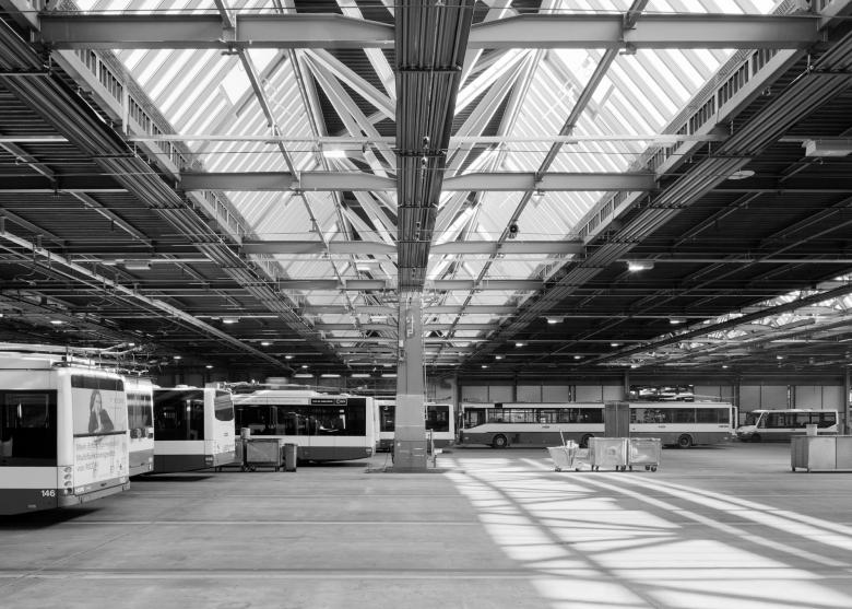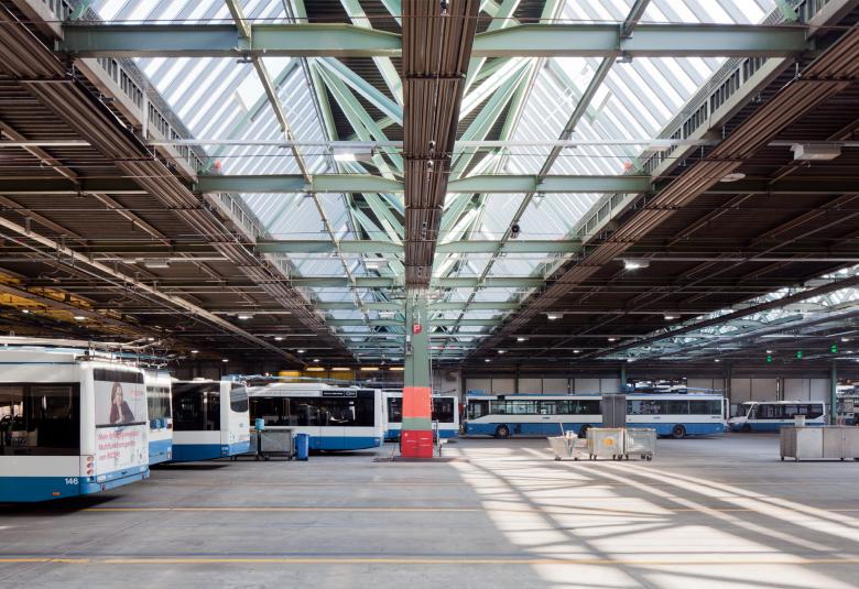 Die 1965-69 erstellte zweigeschossige Bus- und Polizeigarage Hardau wies insbesondere im Brandschutz, in der Gebäudetechnik sowie in der Gebäudehülle einen dringenden Instandsetzungsbedarf auf. Ebenso entsprachen die Arbeitsbedingungen bezüglich Raumtemperaturen, Belichtung und Belüftung nicht mehr den heutigen Vorschriften und Bedüfnissen. Zur Erfüllung der Brandschutzauflagen wurden zusätzliche Fluchtwege im Untergeschoss in die bestehenden Lichtschächte integriert. Die Instandsetzung des Daches umfasste den kompletten Ersatz der Flachdächer und der Sheddachverglasungen. So konnte das Dach entlastet, die Energieeffizienz gesteigert und mit dem Einbau der RWA-Flügel die natürliche Entrauchung sowie der sommerliche und winterliche Wärmeschutz sichergestellt werden. Das charakteristische Raster der Fassadengestaltung wurde durch neue Rahmenprofile und Isolierverglasung beibehalten. Aufgrund der fehlenden Lagerplätze wurden die angelieferten Baumaterialien in Tagesetappen verarbeitet. Da die Busgarage ein 24 Stundenbetrieb ist, erfolgten sämtliche Arbeiten unter laufendem Betrieb.