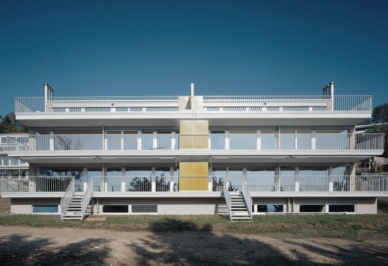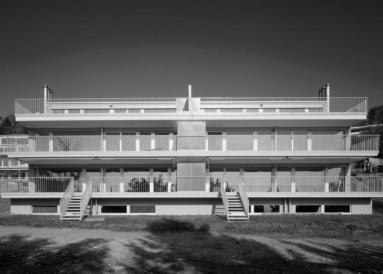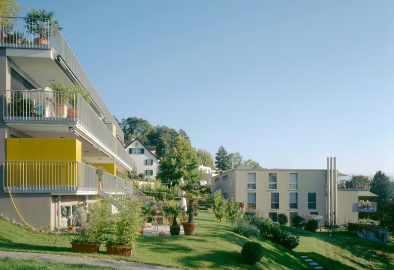 Das stark abfallende Grundstück liegt talseitig an der Glärnischstrasse im oberen Teil von Stäfa und hat eine gute Sicht auf den See und die Berge. Um das Grundstück maximal auszunützen, musste auch der untere Teil der Parzelle bebaut werden. Deshalb wurden zwei Volumen direkt an die Strasse und ein drittes frei im unteren Bereich angeordnet. Eine unterirdische, einspurige Rampe verbindet die drei Baukörper miteinander. In den Sockeln befindet sich die Sammelgarage. Darüber liegen die Wohngeschosse, die oben als Attika zurückversetzt sind. Charakteristisch sind die vielfältigen, flexiblen Wohnungsgrundrisse. Durch die lange, schmale Treppenhausform werden die Wohnungen optimal erschlossen. Die massiven Brüstungen säumen das natürlich belichtete Treppenauge von der Tiefgarage bis zur Attika. Jede Wohnung ist mit dem Lift direkt mit dem Untergeschoss verbunden. Die Frontfassade liegt hinter den durchlaufenden, grosszügig auskragenden Terrassen und sie erscheinen wie Decks. Durch die freie Fenstereinteilung an den Seiten- und Rückfassaden wirken die viergeschossigen Baukörper ungezwungen und jede Fassadenseite erscheint anders.