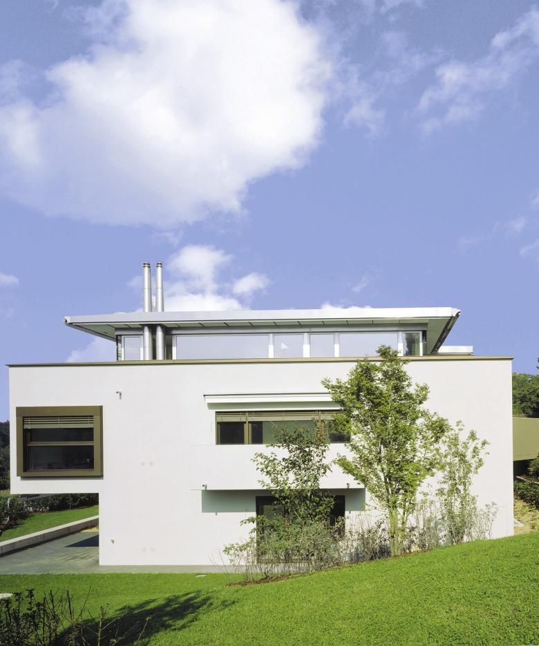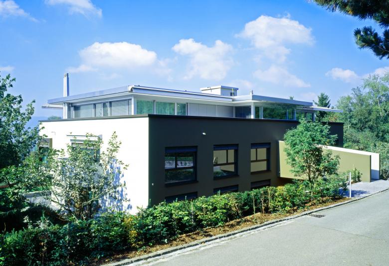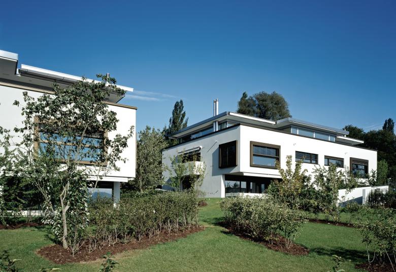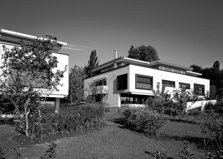 Auf dem unmittelbar an die stark befahrene Zumikerstrasse tangierenden Grundstück mussten verschiedene Wohnungstypen mit maximaler Ausnützung geplant werden. Die Einheiten sollten einen hohen Standard und die Auflage der Minergie aufweisen. Das Projekt zeigt zwei praktisch identische Volumen, die möglichst an die nordöstliche Ecke der Parzelle situiert sind, so dass ein grosser, nach Süden orientierter Garten entsteht. Eine Stützmauer entlang der Baulinie begrenzt die Aufschüttung und unterbricht die Sichtverbindung zwischen Strasse und Baukörper: Der Schall- und Sichtschutz ist so optimiert. Die Baukörper beinhalten je fünf grosszügige, lichtdurchflutete, individuell ausbaubare Wohnungen unterschiedlicher Grösse und Charaktere. Alle Wohnungen sind durch eine gemeinsame Tiefgarage miteinander verbunden. Die Grundrisse sind deutlich in Tag- und Nachtbereich gegliedert: So befinden sich das Schlafen konsequent im hinteren, nordöstlichen Bereich, das Wohnen, Arbeiten, Spielen etc. im vorderen, südwestlichen Teil. Die Gliederung der Grundrisse widerspiegelt sich in der Fassadengestaltung: rückwärts die eher grossen Fensteröffnungen auf dunkler Fassadenfarbe, vorne mittelgrosse Fenster auf hellerer Fassadenfarbe.