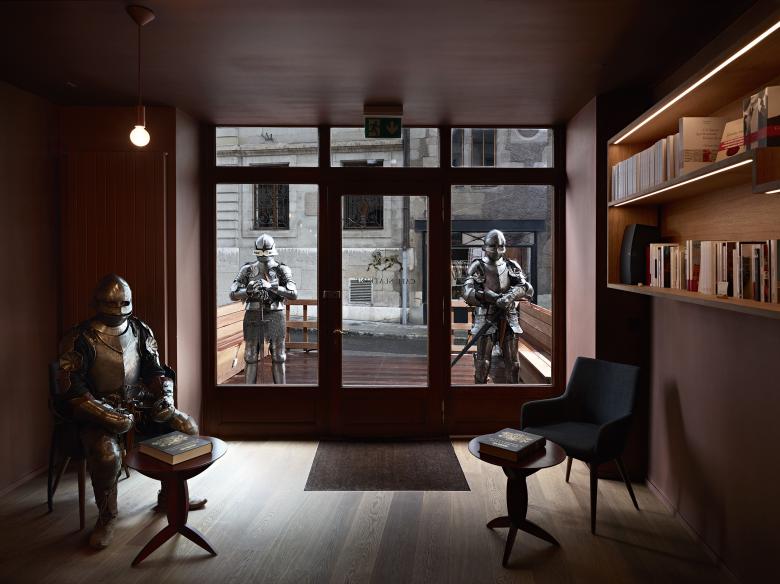 Sur l'arrière, une seconde salle se dévoile, plus intime. Ce qu'on pourrait appeler un stamm. Un lieu parfait pour des réunions plus confidentielles. Une même bibliothèque travaillée sur trois hauteurs différentes en orne le mur du fond. La lumière est ici zénithale, naturelle en journée, car cet espace a été gagné en son temps sur une petite cour intérieure. Comme témoignage du préexistant de la Vieille-Ville genevoise, une fontaine murale et des encadrements d'anciennes arches et fenêtres ont été révélés, nettoyés et exposés en l'état. Toujours le mariage des contraires.