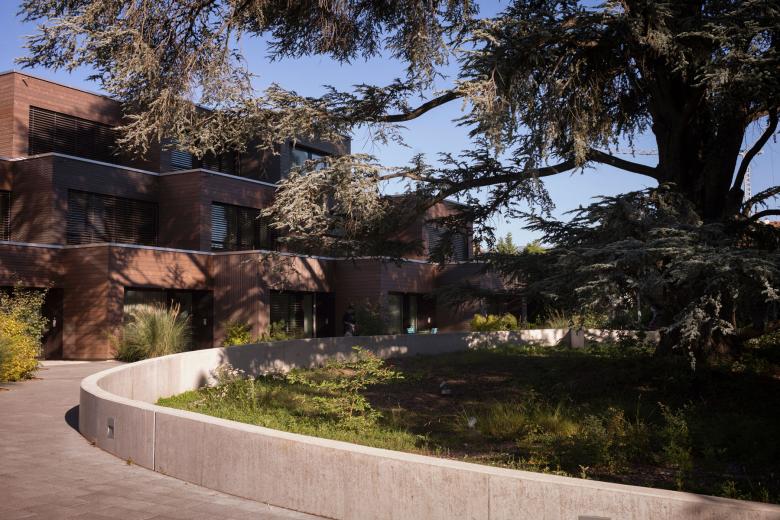 Cedar Housing is like a treehouse inside the city. The project finds strength in its ability to embrace opposites: remote and central, natural and urban, individual and collective, private and shared, dense and quiet, minimal and comfortable. The housing consists of six triplexes lined up, with duplexes on each end. Strong from its context, it follows the circular shape of the site's centenary-old cedar. Its tiered form, dents and offsets allow for various social experiences and dialogue between urban densities. Variations in the cladding modify the perception of scale, revealing the story of an imaginary escape in the woods.