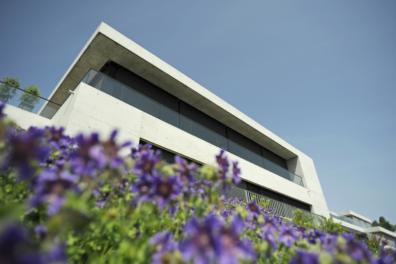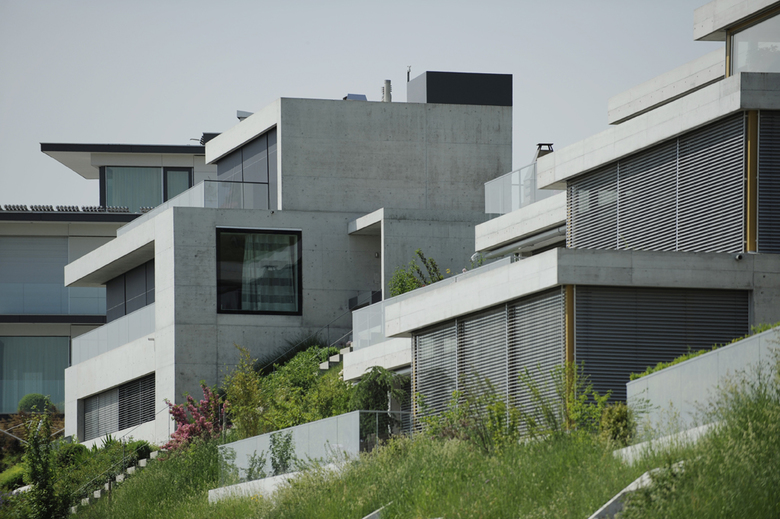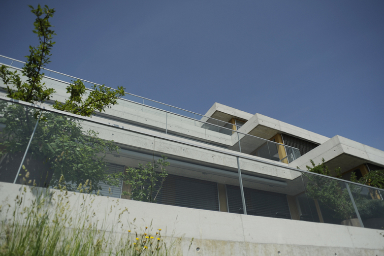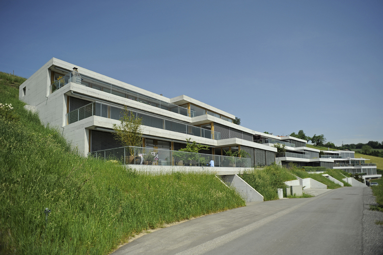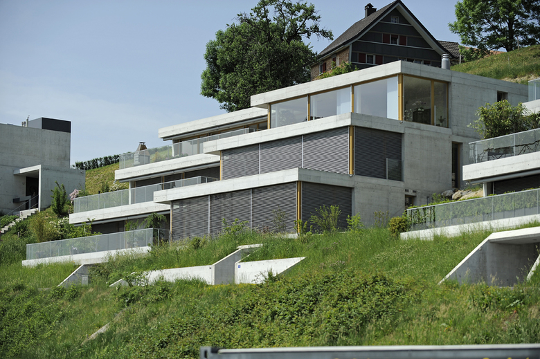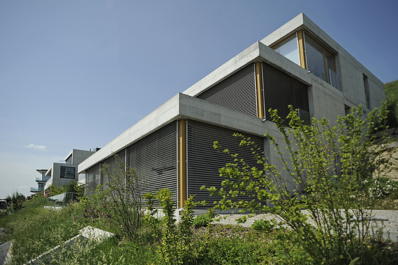Die Hanglage, die einmalige Aussicht und die Parzellengeometrie legten die Konzeption der Baukörper als autarke Terrassenhäuser nahe. Das Einfamilienhaus vermittelt zum bestehendem Einfamilienhausquartier, welches sich westlich anschliesst. Beide Gebäudetypen werden einheitlich gestaltet.
