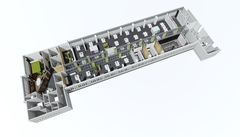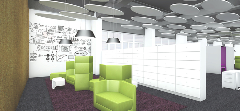 fsp: Mit der Erstellung des Pilotprojektes im Rahmen von Workplace 2020 entstehen im ersten Obergeschoss des Gebäudes 1906 zukunftsweisende und moderne Arbeitsplätze, entsprechend den neuesten Erkenntnissen für kreative Arbeitswelten. Der Open Space der Büroflächen wird mit Focusboxen und Bereiche für Informal Meetings im Cosy Style zoniert. Die Trennwände zum Korridor sind je nach Nutzung mehr oder weniger transparent und der Break Room bietet differente Zonen zum Relaxen und Arbeiten.