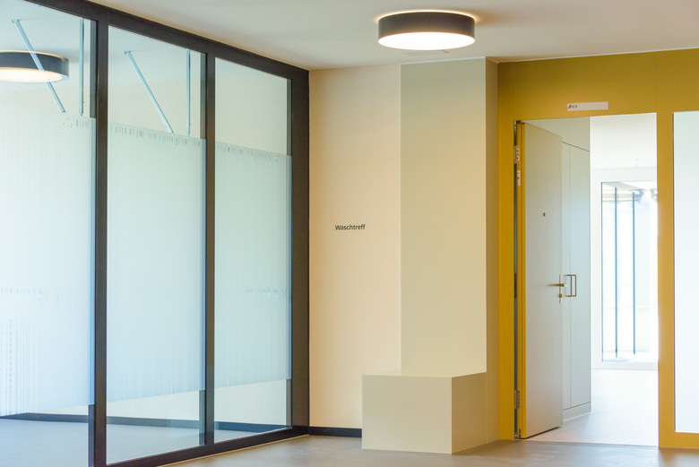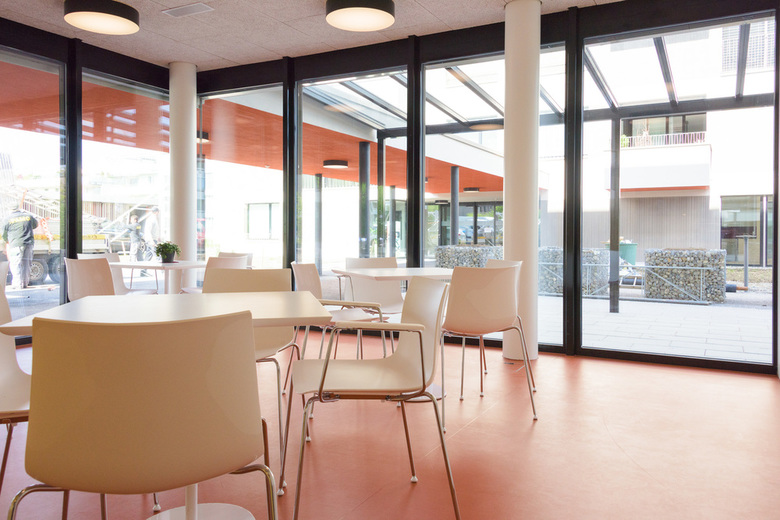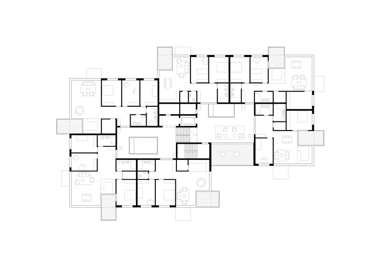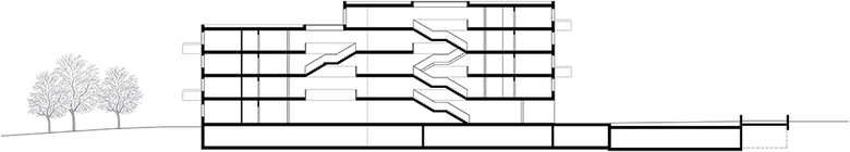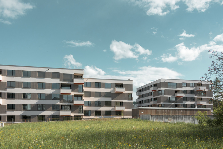 fsp: Das städtebauliche Konzept sieht grössere, wirtschaftliche Baukörper vor, welche jedoch durch Gebäudeversätze massstäblich gegliedert werden. In Anlehnung an eine gewachsene Dorfstruktur entstehen im Innenbereich der Bauten differenziert gestaltete Begegnungszonen. Ein Atrium mit attraktiver Treppenanlage verbindet die vier Regelgeschosse der Bauten. Ein zweiter „Dorfplatz“ des Gebäudes, welcher sich im Erdgeschoss zum Aussenraum hin orientiert holt die Natur über eine begrünte Wand in das Gebäude und die Obergeschosse.