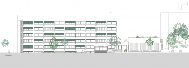 Eine sanfte Renovierungsstrategie bewahrt das emblematische Betongitter der Fassade, ersetzt die Füllelemente durch vorgefertigte Holzelemente und integriert eine Dämmschicht zur Verbesserung der Klimahülle. Architektonisch wird auch die Nachhaltigkeit zum Thema, indem die Brüstungen im Re - Use Prinzip durch die alten aufbereiteten Fenstergläser materialisiert werden.