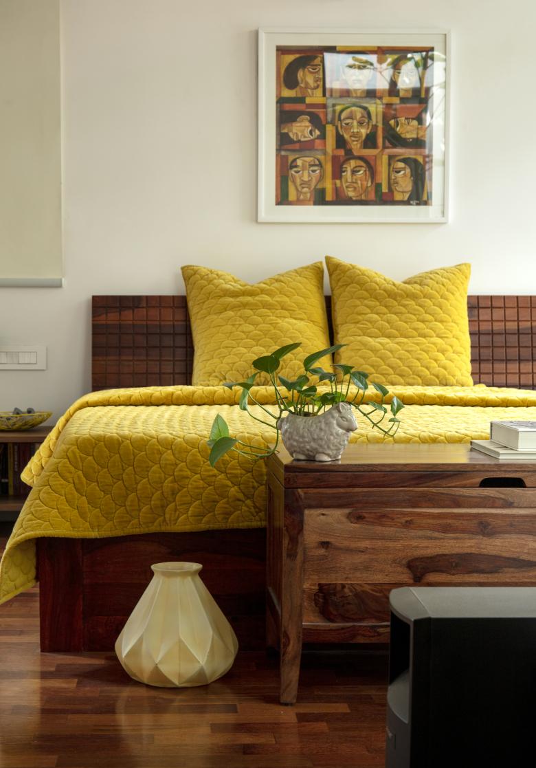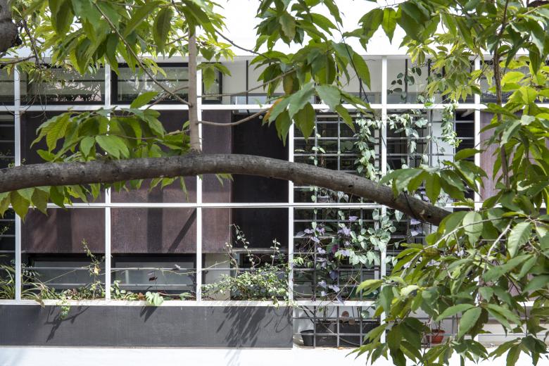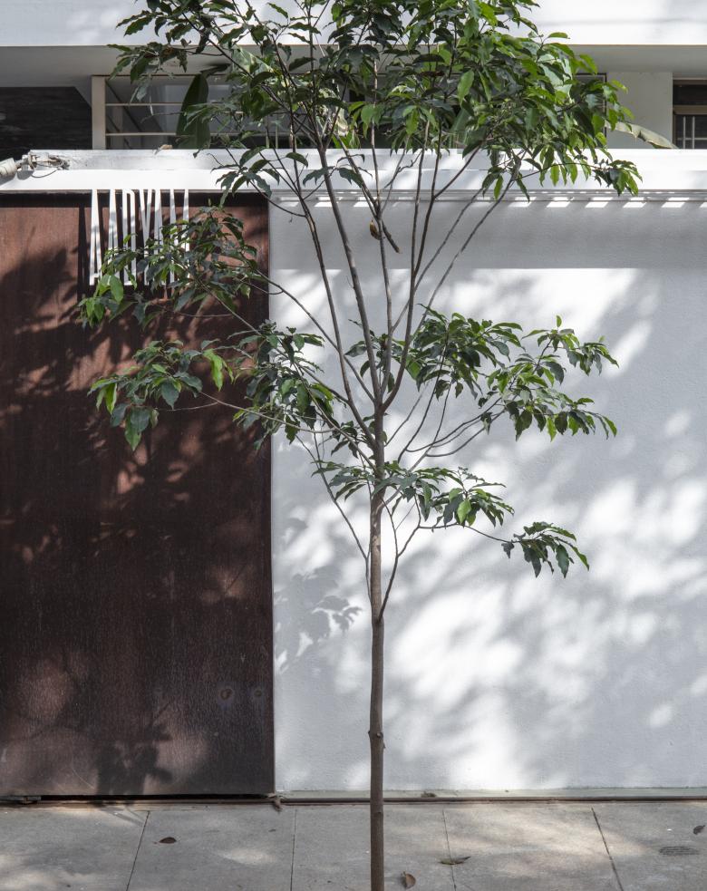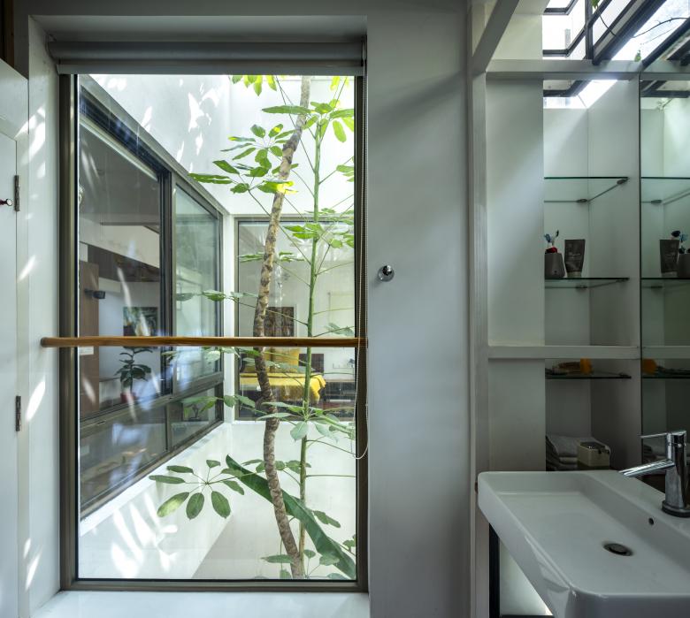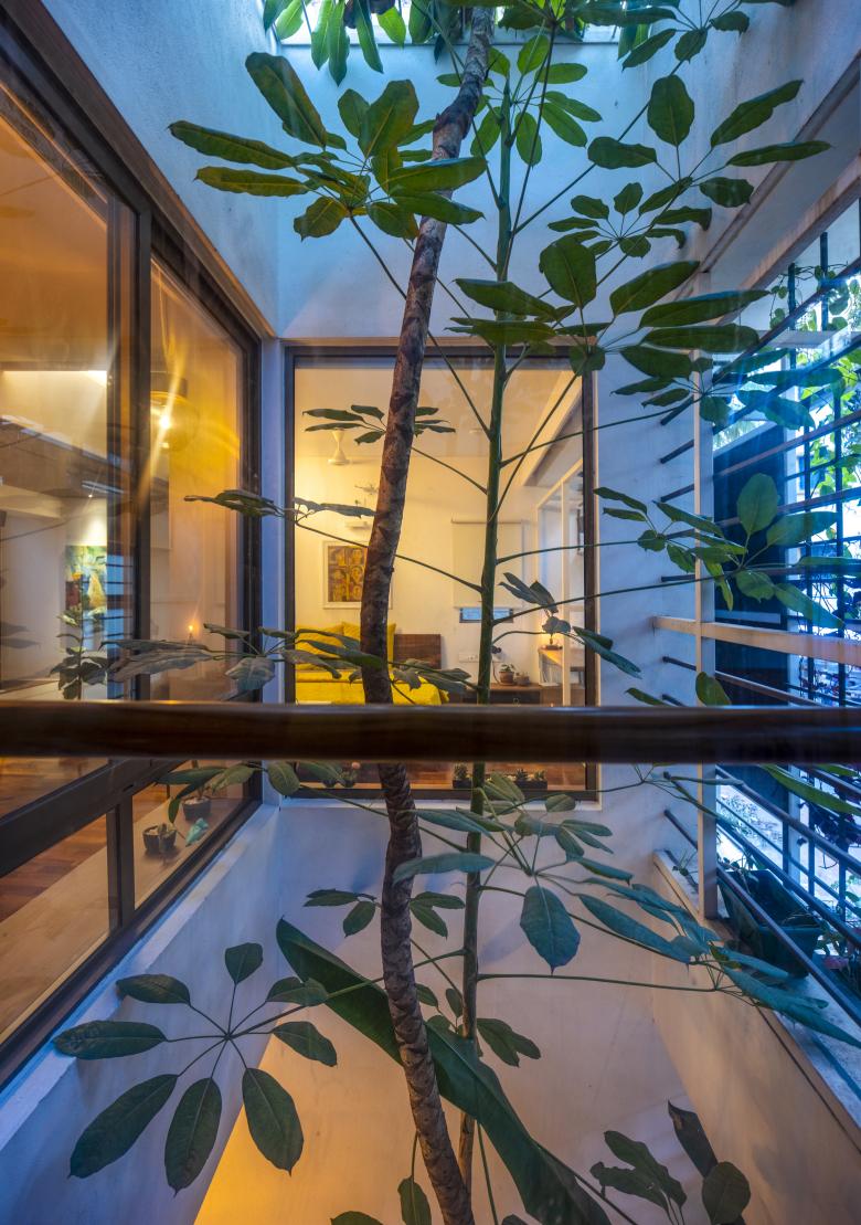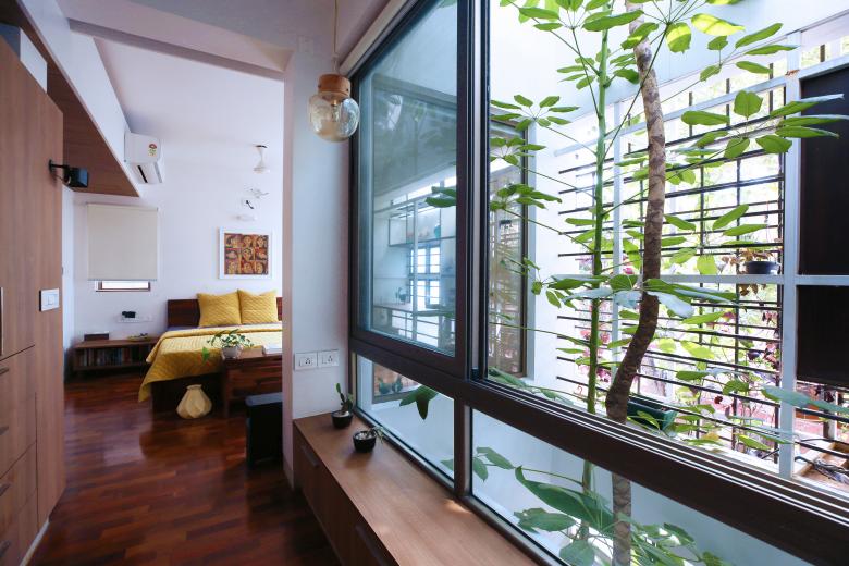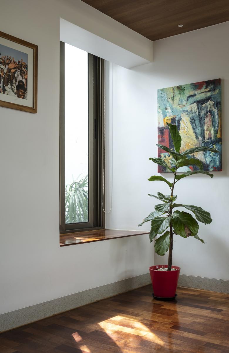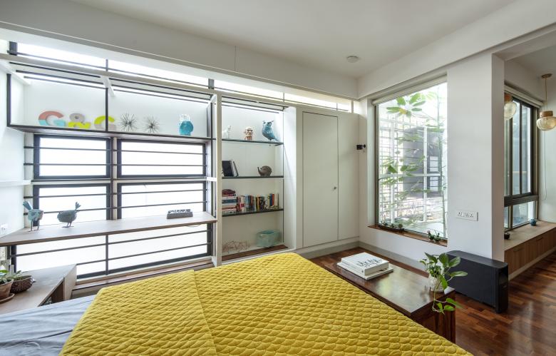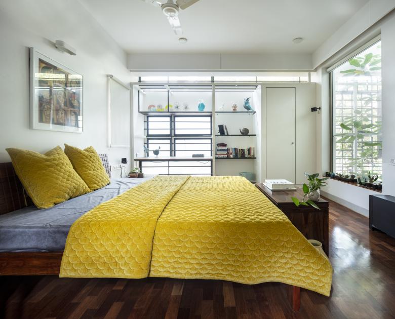 The Master Bedroom towards the front west side, turns into a suite with a cut-out separating the bathroom and sleeping areas. A tree (from the front garden in the ground floor) grows through this cut-out, simulating an internal courtyard. The Guest Bedroom in the south-east corner, opens into the Elevated Garden with a bay window, similar to the Master Bedroom.