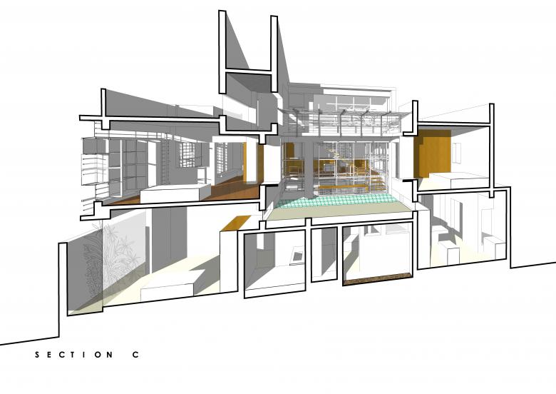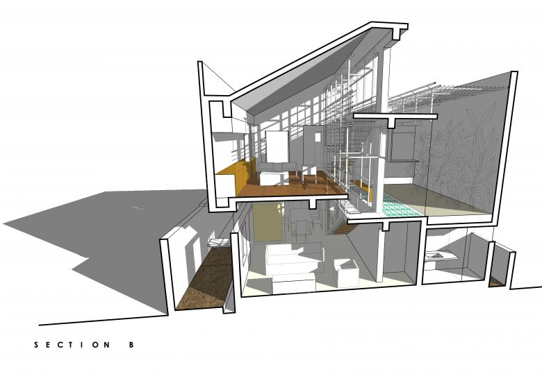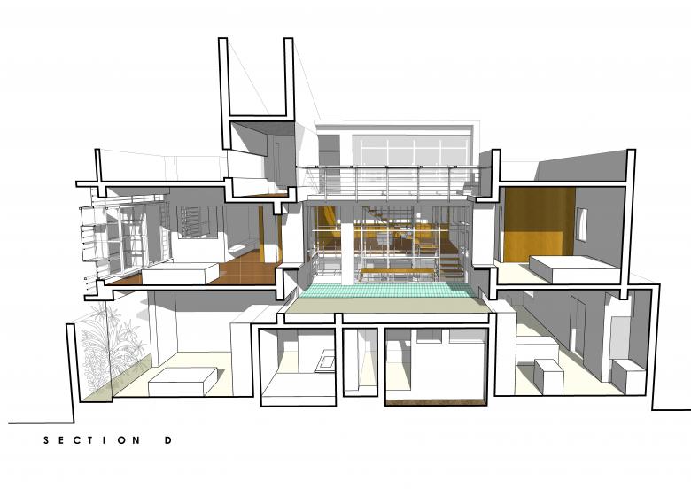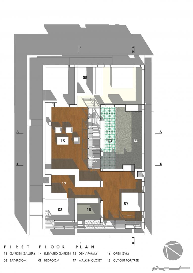 The first floor revolves in a 'C' shape around the Mezzanine and the Elevated Garden, and houses a bedroom on either side with a large hybrid space in the middle. This Hybrid Space lines up with the Elevated Garden in length, and has a sloping roof expanding its volume and the light filtering into it. The Hybrid Space engages face-to-face with the Mezzanine and the Elevated Garden, creating a space that serves as a den, a library, a lounge area, an AV room and a second living room for the couple.