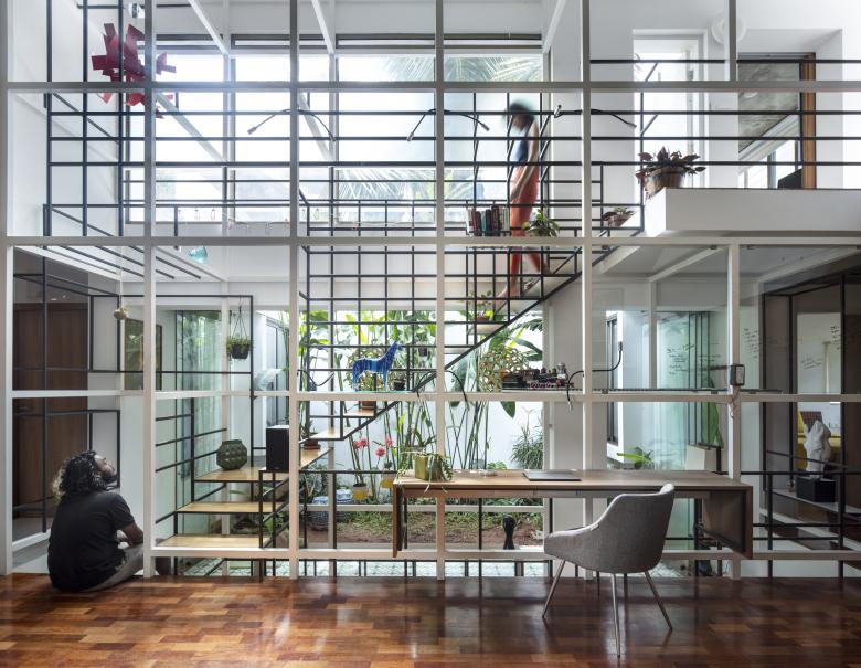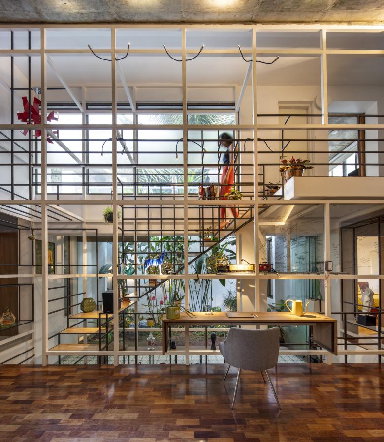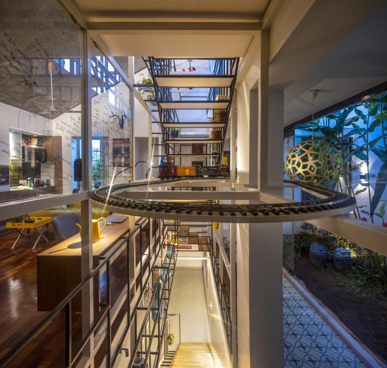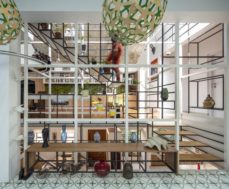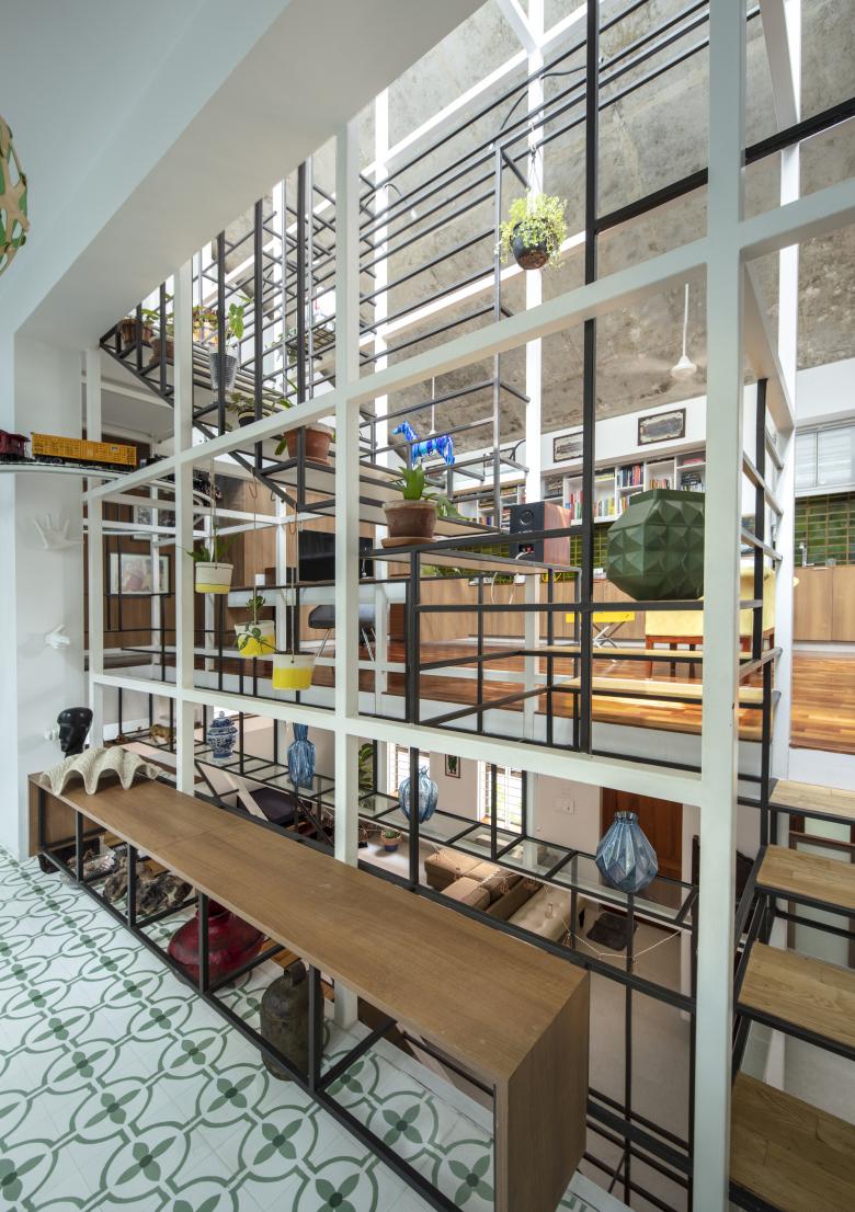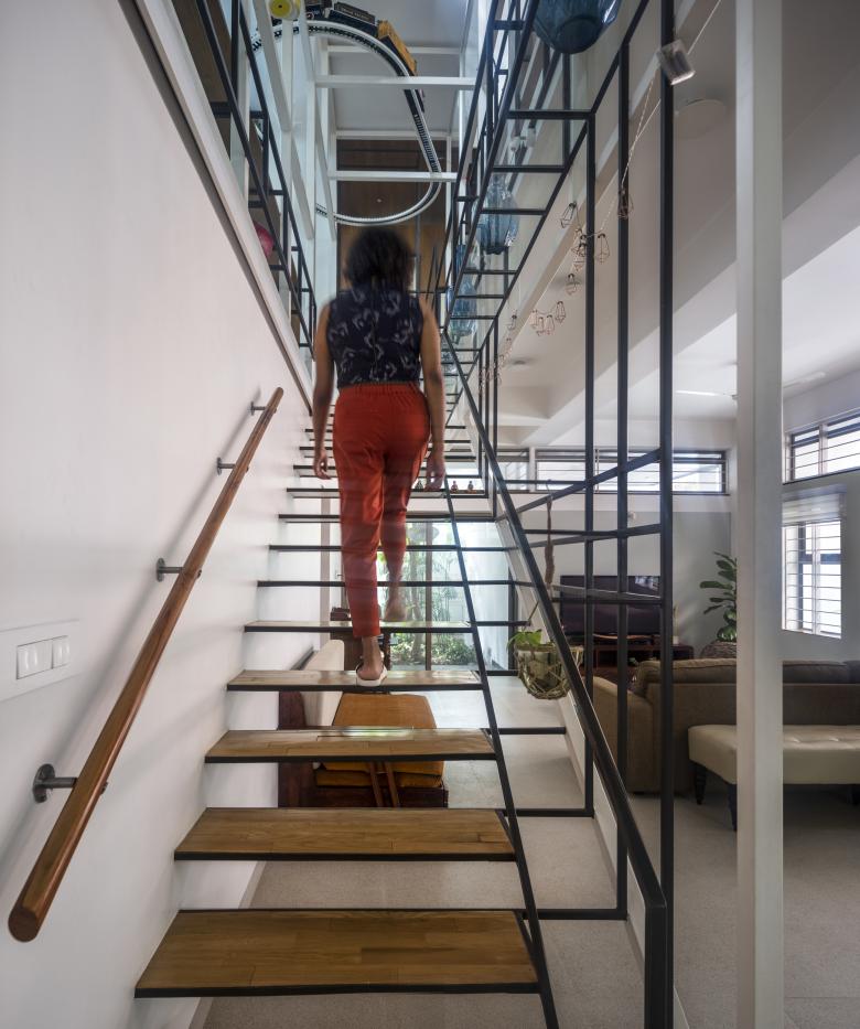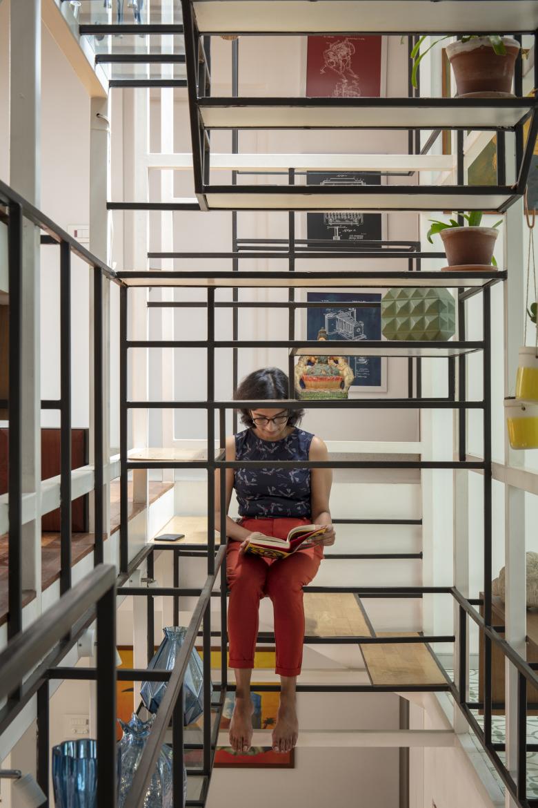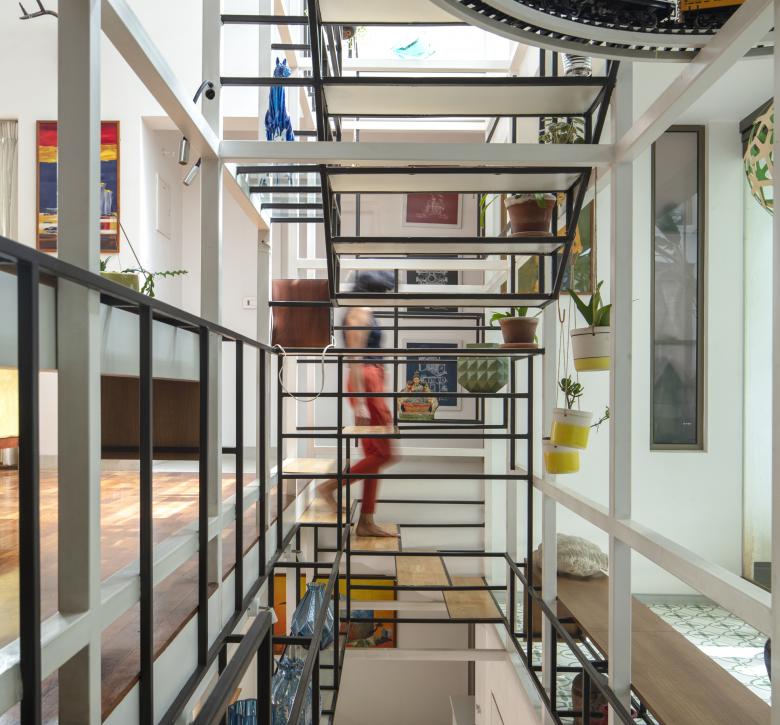 The staircases of the house run through a central vertical shaft connecting all the spaces together. This is the Steel Space frame; a language derived from the internal geometry; widths and the heights of the house.
