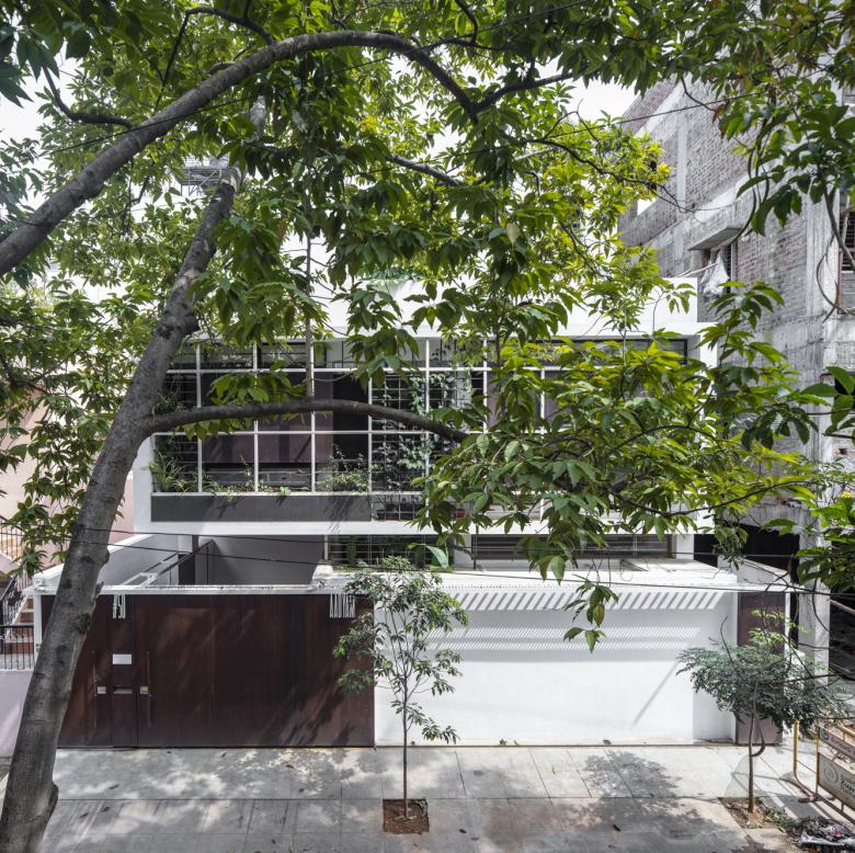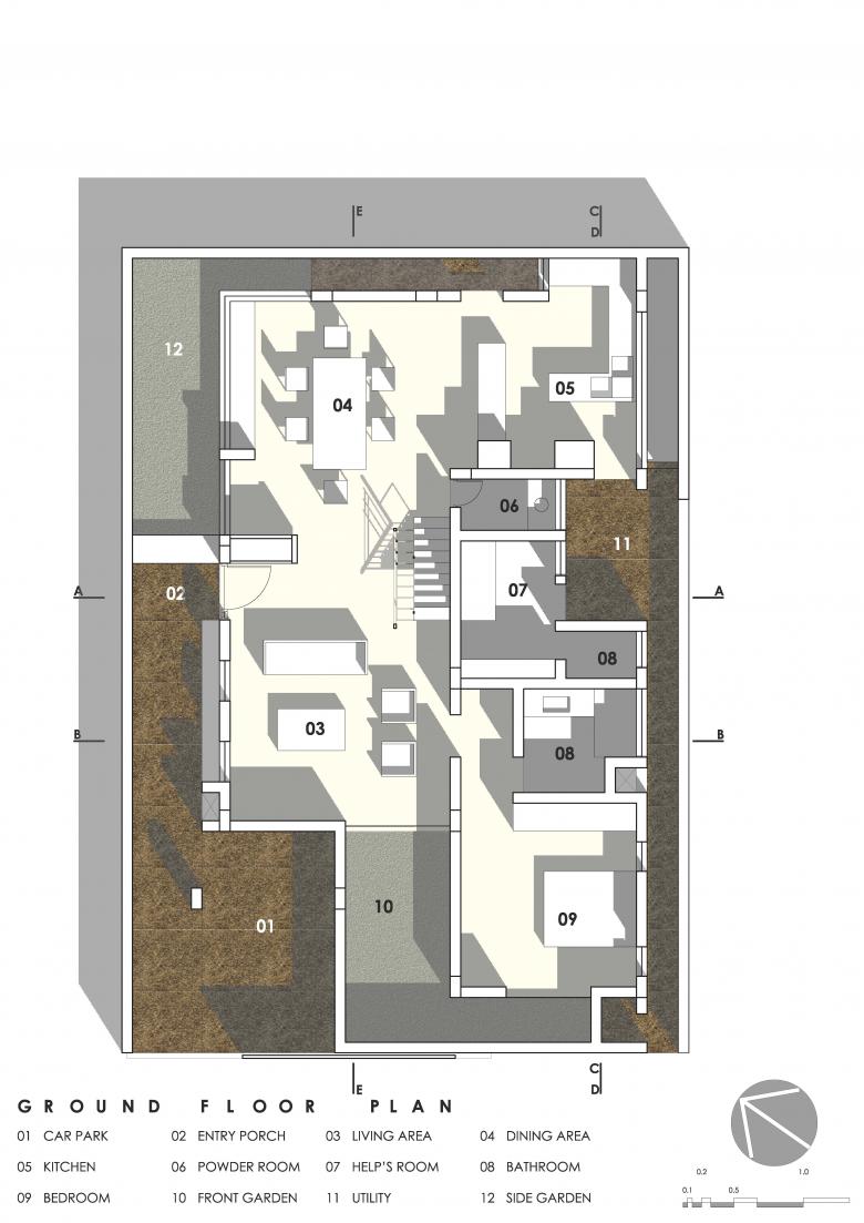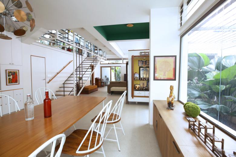 The north-east corner of the first floor is left open, with green planters shielding it from neighbouring houses. This area is used as a Gym and a sit-out.