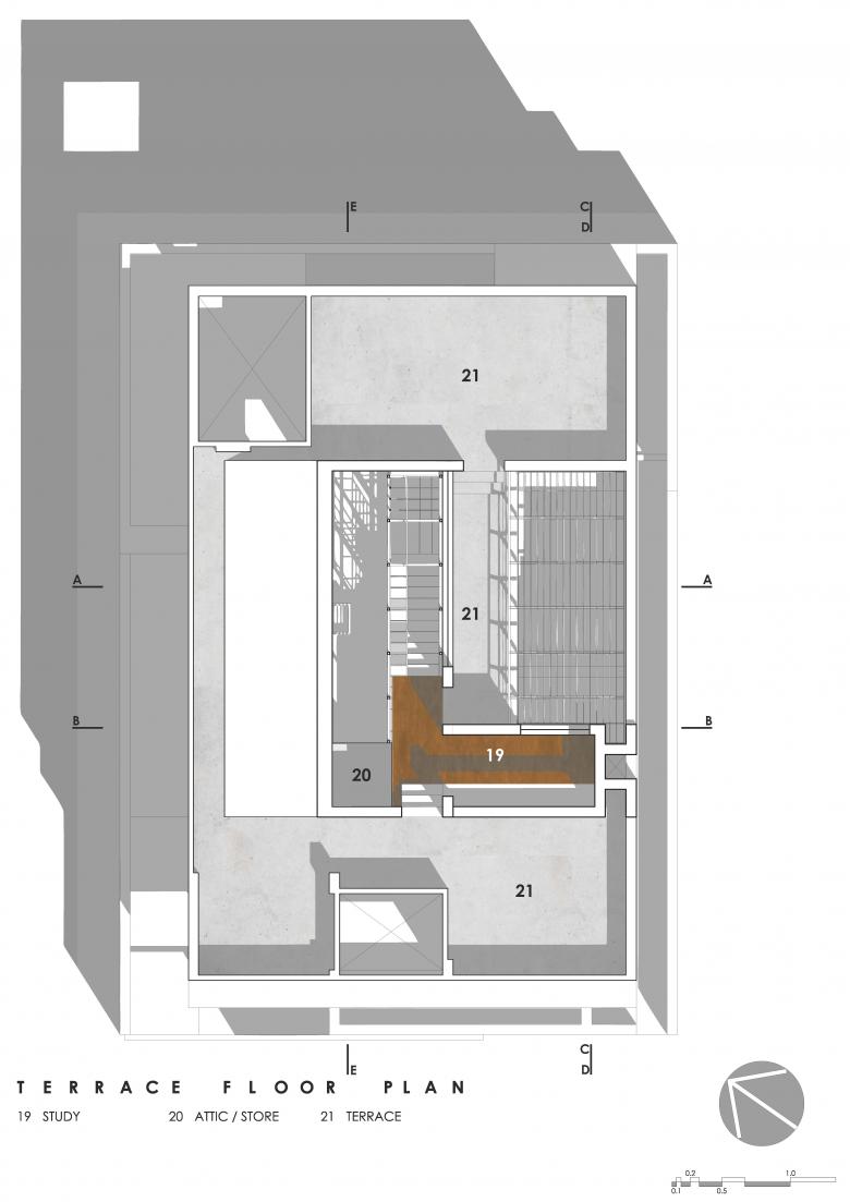 The roof houses the Study, a calm secluded space overlooking the Elevated Garden through large windows, from above.