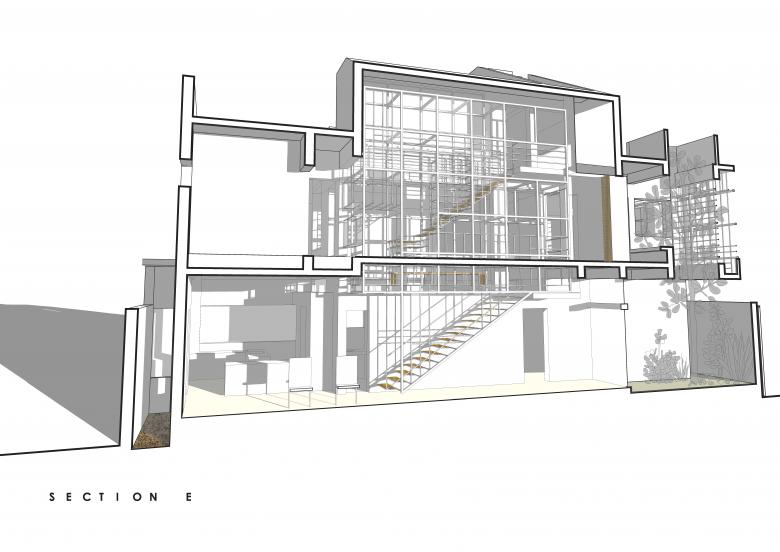 This Elevated Garden becomes the heart of the house, commanding views from both the ground floor and the first floor. It is also the central source of light and ventilation for the house, as it opens up to the sky and the weather. A Gallery runs alongside the Elevated Garden with fully collapsible high glass doors.
