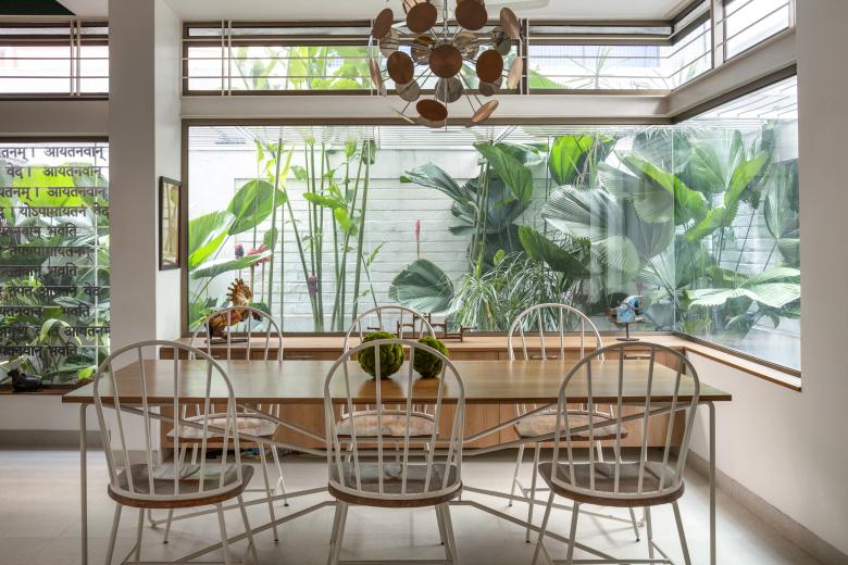We began work using the existing structure and following the Client’s strict brief for Vaastu principles which dictated the positions of most of the spaces in the plan. We also wanted to make this house self- sufficient in terms of light and ventilation, since the neighbourhood was already starting to see restructuring, where the old houses were giving way to high-rise apartments, leading to an increasing dearth of privacy, light and ventilation.