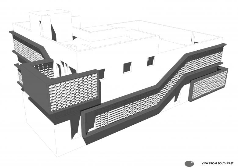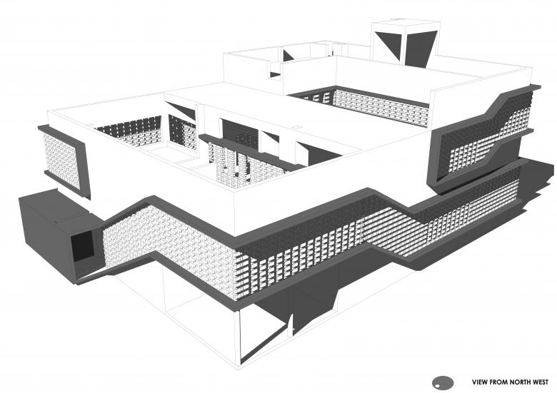 Sitting heavily on the site with the visual of a large brutal structure, the external walls of the Inside Out House go right out to enclose a 'world' inside. The large white volume is punctuated by indecipherable bands of bricks and raw concrete snaking around this monolith. The only significant penetration in this volume is the car park towards the north west that combines with the entry to gesture a relent.