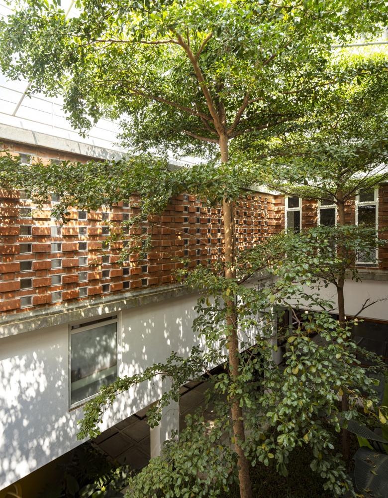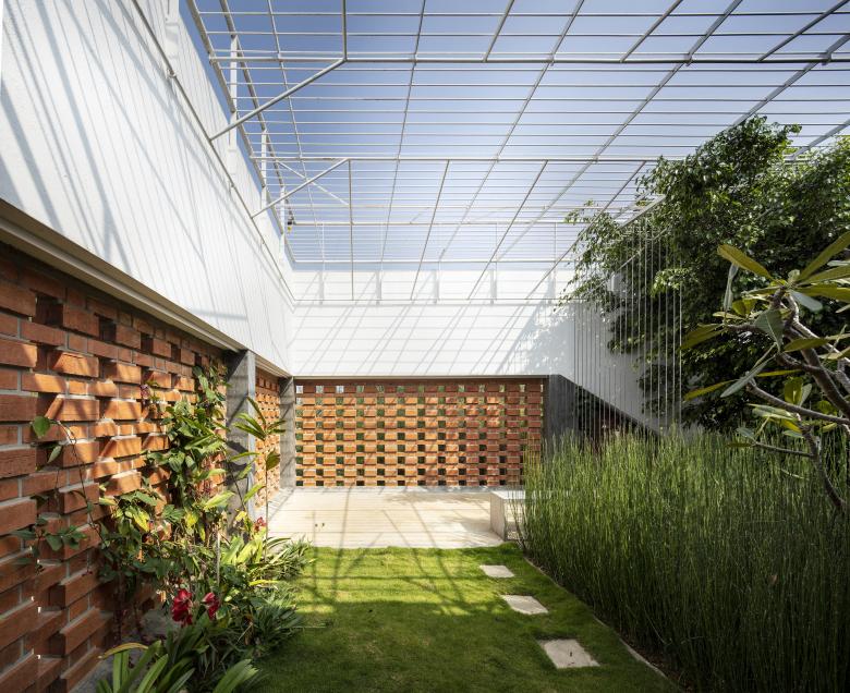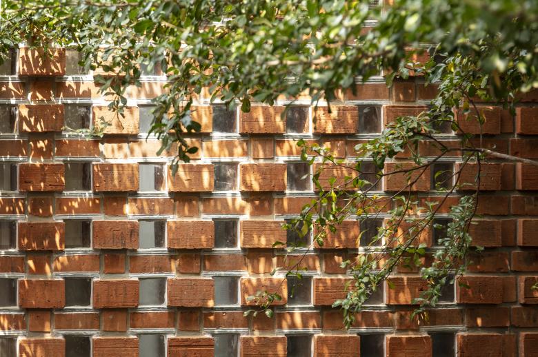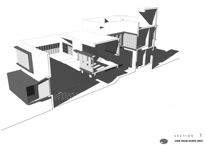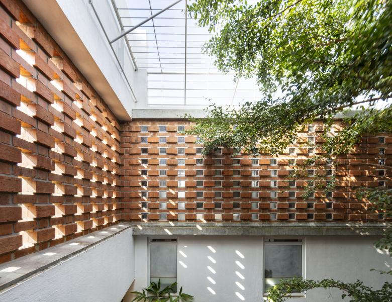 The spaces melt into each other dissolving boundaries and definitions, and surrendering any sense of bearing. The brick walls run through the house structuring its transitions and overlaps, scaling each space by its shifts, and tying all the varied experiences together as a cohesive memory. Their dotted light patterns combine with the light pouring through the tree tops to breathe life into the house.