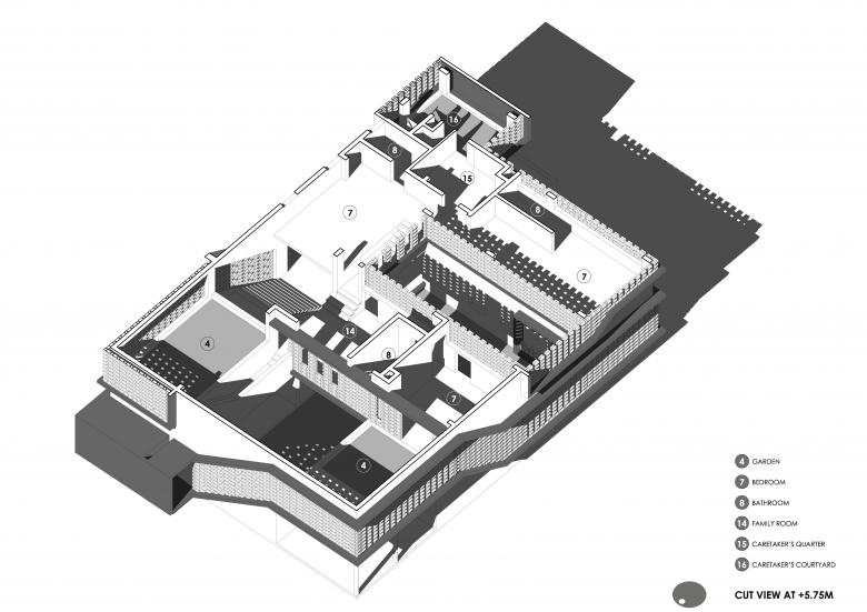 The service area of the house comes in towards the south east, with a utility area in the ground floor and a caretaker's area in the first floor.