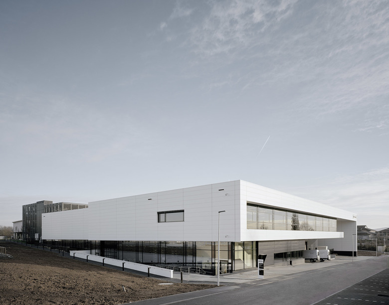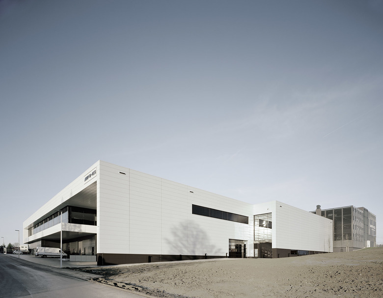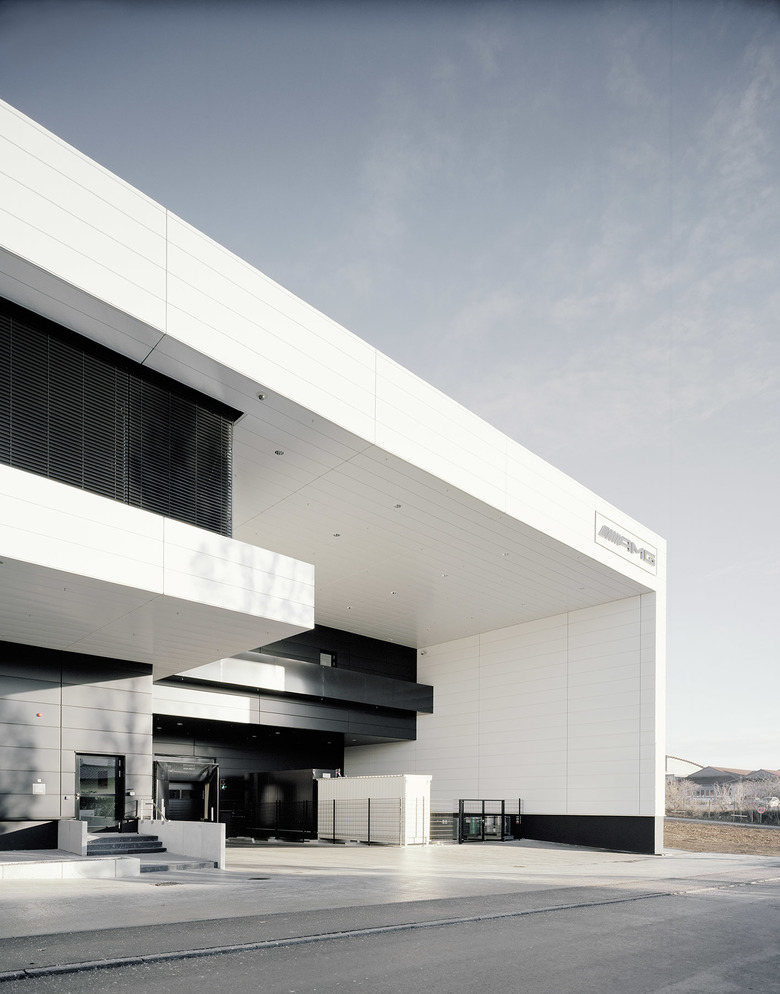 Äußerlich fügt sich das Gebäude in das Corporate Design von Mercedes-AMG ein. Große weiße Flächen, die den Bürokern im Westen umschließen, bilden das gestalterische Konzept. Die weiße Fassade aus horizontal verlegten Stahlkassetten bildet den Kontrast zu einem danebenstehenden Parkhaus mit schwarzer Lamellenfassade. Zur Nutzung des Tageslichts wurden insbesondere Flächen an der Nordseite großzügig verglast und zusätzlich Oberlichter im Dach eingeplant.