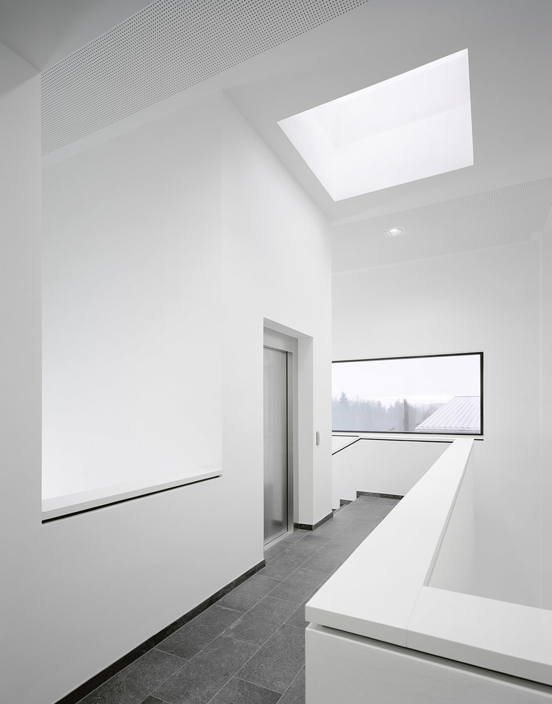 Das Gebäude wird über ein zentrales großzügiges Treppenhaus erschlossen. Von hier aus gelangt man in die Halle, die Büroebene sowie die Dusch- und Umkleideräume. Der Zugang wurde fernab der Rangierbereiche gelegt, um den Personenfluss klar vom Anlieferverkehr zu trennen.