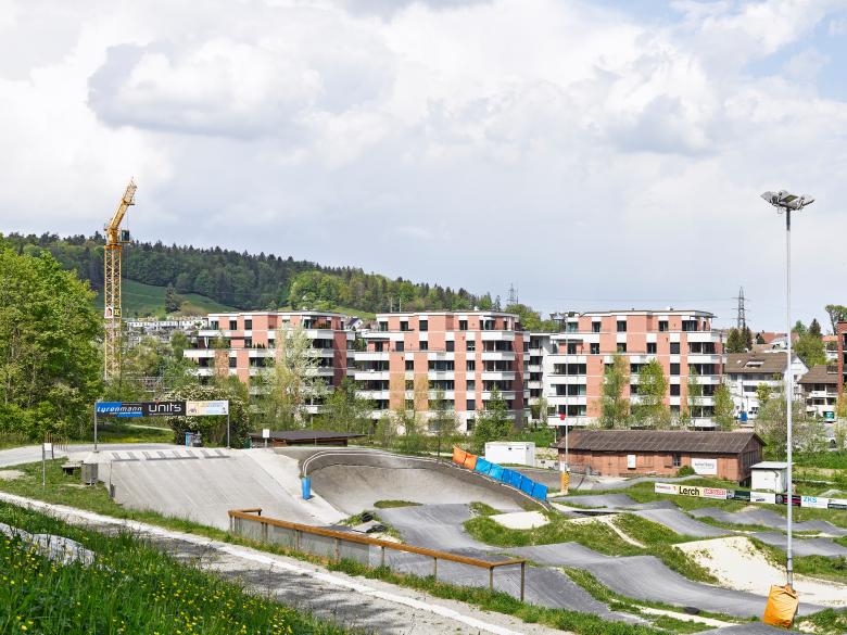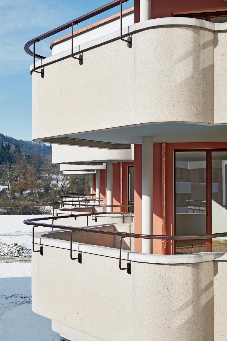 Am Übergang von der Besiedlung zum Landschaftsraum entsteht ein neuer Stadtteil / Der zusammen mit Krebs und Herde sowie Fischer Architekten entwickelte Masterplan soll etappenweise umgesetzt werden / Südseitig zum zentralen „Ziegeleiplatz“ steht ein verputzter fünfgeschossiger Bau mit Alterswohnungen und einem Café (Baufeld II) / Weich gerundete Balkone aus vorfabriziertem Beton geben dem hell verputzten Kubus eine elegante Anmut, die Materialwahl und ein präzise gezeichneter Dachrand verleihen dem Bau einen wertigen handwerklichen Charakter.