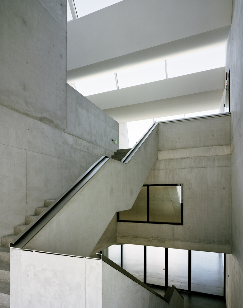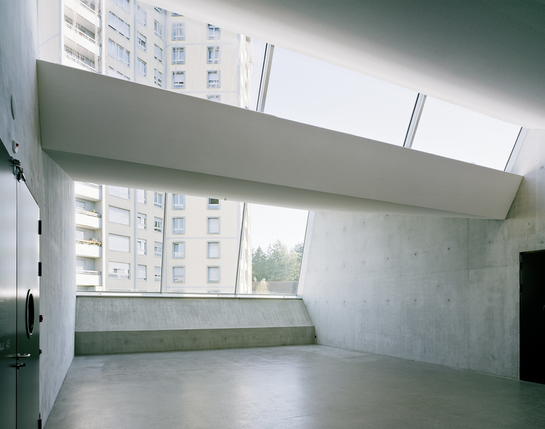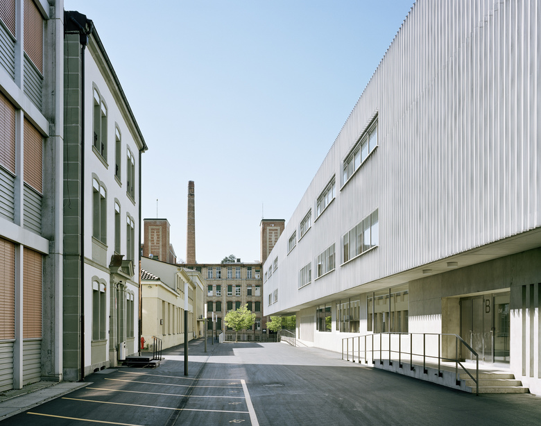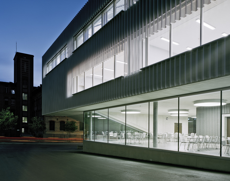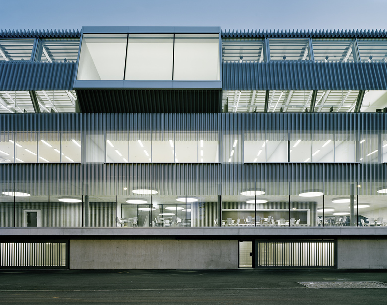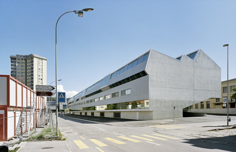 Neue Lehrwerkstätten für technische und industrielle Berufe / Der langgezogene, liegende Gebäudekörper fügt sich in den grossmassstäblichen Ort des ehemaligen Industriequartiers ein und steht in engem Dialog mit der Vertikalität des an der Kreuzung gelegenen Hochhauses / Eine über die gesamte Länge unveränderte Schnittfigur ist Ausdruck einer geschossweisen Nutzungszuteilung mit Werkstätten im obersten Geschoss / Der prägnante Schnitt und die lineare innere Organisation verleihen dem Volumen die Eigenheit eines metallenen Profils oder Werkstückes / Der serielle Aufbau, die Konstruktion und die Materialisierung geben dem Projekt eine industrielle Prägung.