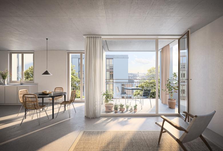 Das Projekt nimmt das geforderte dichte Programm in einer prägnanten Komposition zweier Baukörper unterschiedlicher Form und Bauhöhe auf / Ein Gebäuderiegel entlang der Hardstrasse erweitert die Blockrandzeile und sucht mit einem Sprung von 4 auf 7 Geschosse seine massstäbliche Verortung / Der zweite Baukörper besitzt eine sechsgeschossige, kammartig ambivalente Form, welche sich – erschlossen über eine Rue Intérieure – in die Tiefe der Parzelle entwickelt.