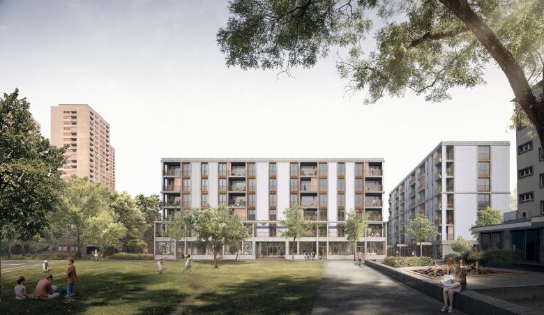 Nutzung: 122 Genossenschaftswohnungen, Gewerbe, Ateliers, Kindergarten, Personenmeldeamt, Jugendladen