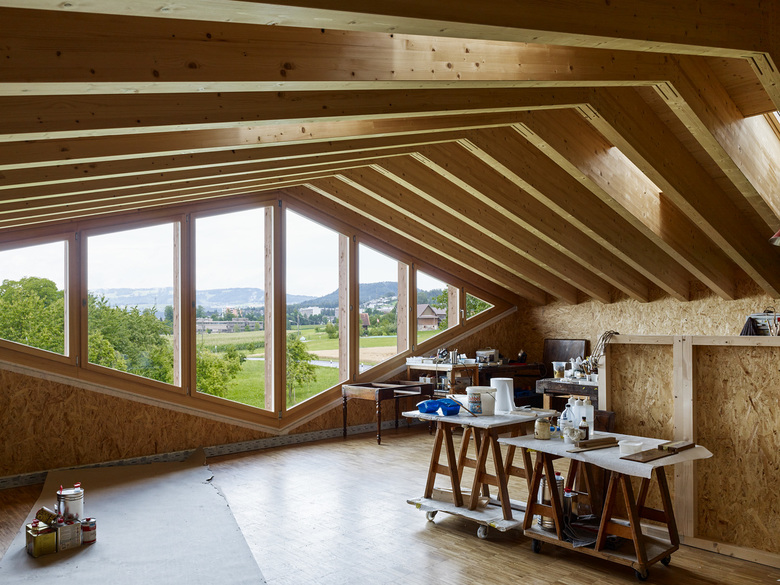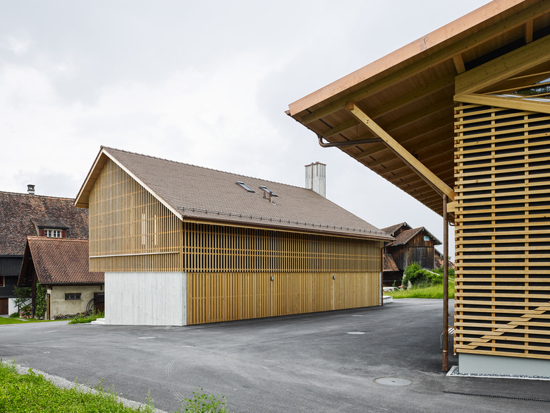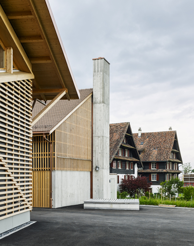 Im historisch bedeutsamen und längst inventarisierten Ensemble eines Zuger Gehöftes aus dem 17. Jahrhunderts gilt es, eine Remise und eine Militärbaracke aus den 1960er Jahren zu ersetzen / Zwei Bauten mit neuem Programm, eine Schreinerei mit Restaurationsatelier und eine Heizzentrale mit Büros und Autounter-stand, werden hierzu neu erstellt / Ihre Stellung und markante Dachform, ein auffälliger Betonkamin und das Baumaterial Holz in zeitgenössischer Anwendung und sorgfältiger Detaillierung prägen die neuen Bauten / Dabei werden zwei grosse Fensteröffnungen in den Giebelseiten des Ateliers zu eigentlichen „Schaufenstern“ ausformuliert, die dem Ensemble eine spezifische, weitherum sichtbare Prägung verleihen.