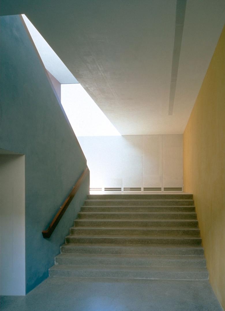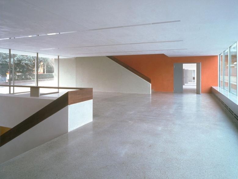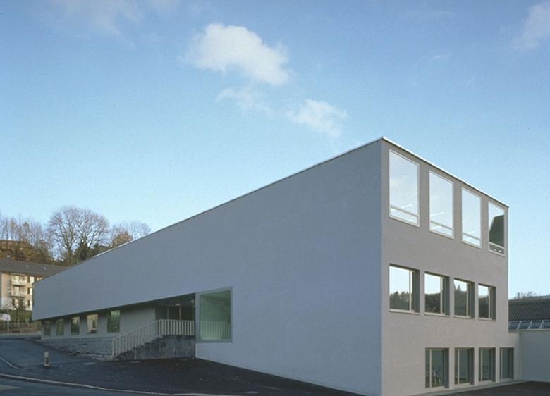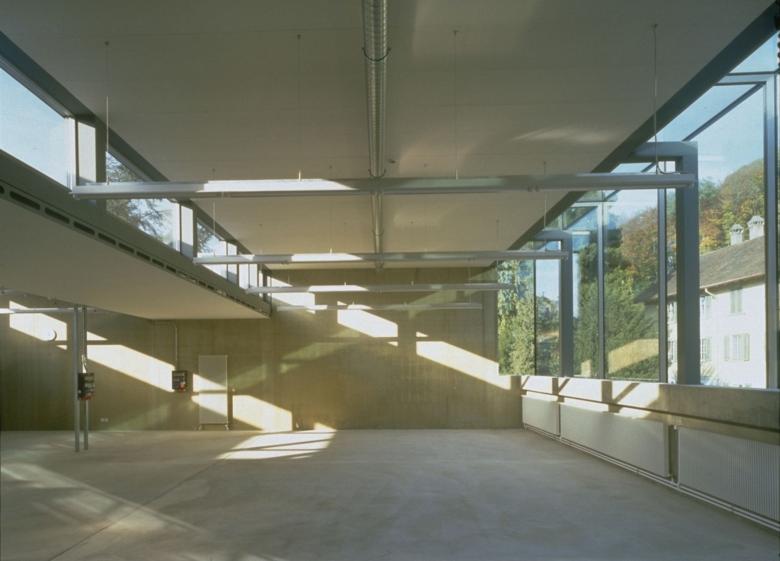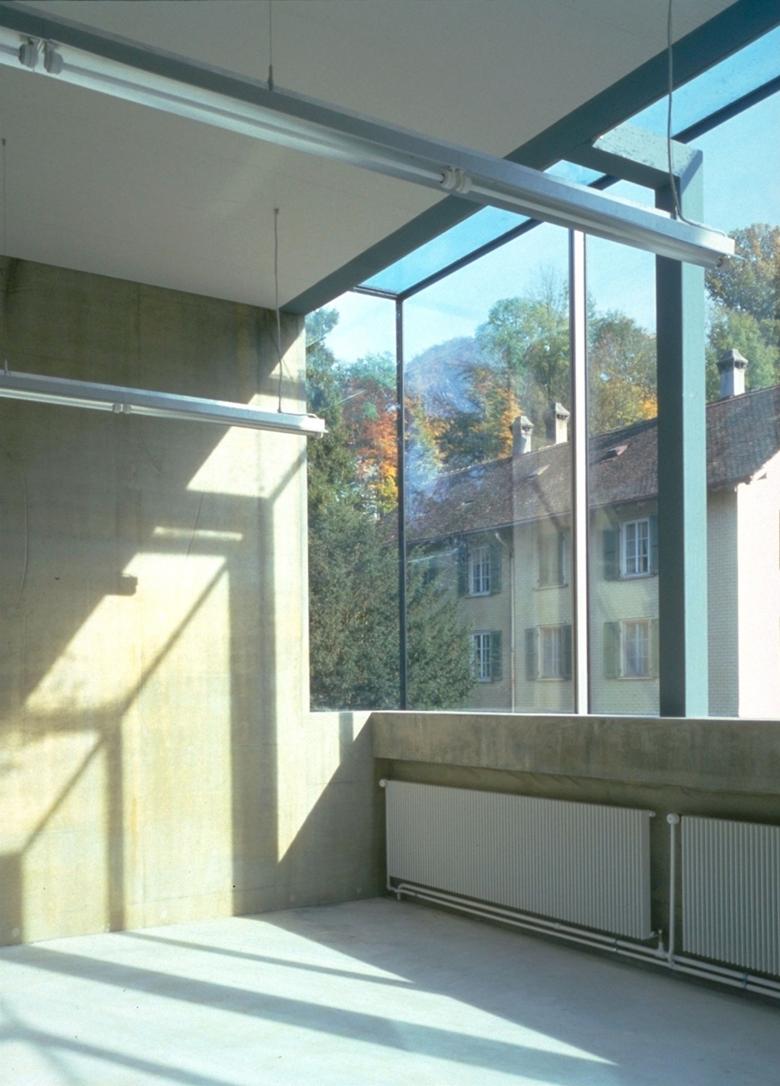 Mit dem Neubau der Lehrwerkstätten Bern wird den umgenutzten Hallen der alten Spinnerei ein markanter, nördlicher Abschluss vorangestellt und ein grosszügiger Aussenraum und Eingangsbereich geschaffen / Einschnitte verleihen dem Gebäude seine plastische Prägung und akzentuieren die Stellen im Volumen, an denen Oblich-ter oder strukturelle Verglasungen liegen / Schlüssel zum räumlichen Verständnis des Projektes bildet das Foyer im Eingangsgeschoss / Zwei lateral angeordnete Treppen und die Zugänge zu Lehrerbereich und Administration verweisen auf das räumliche Dispositiv.