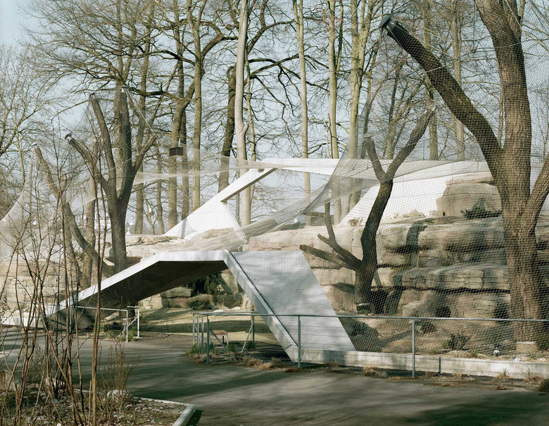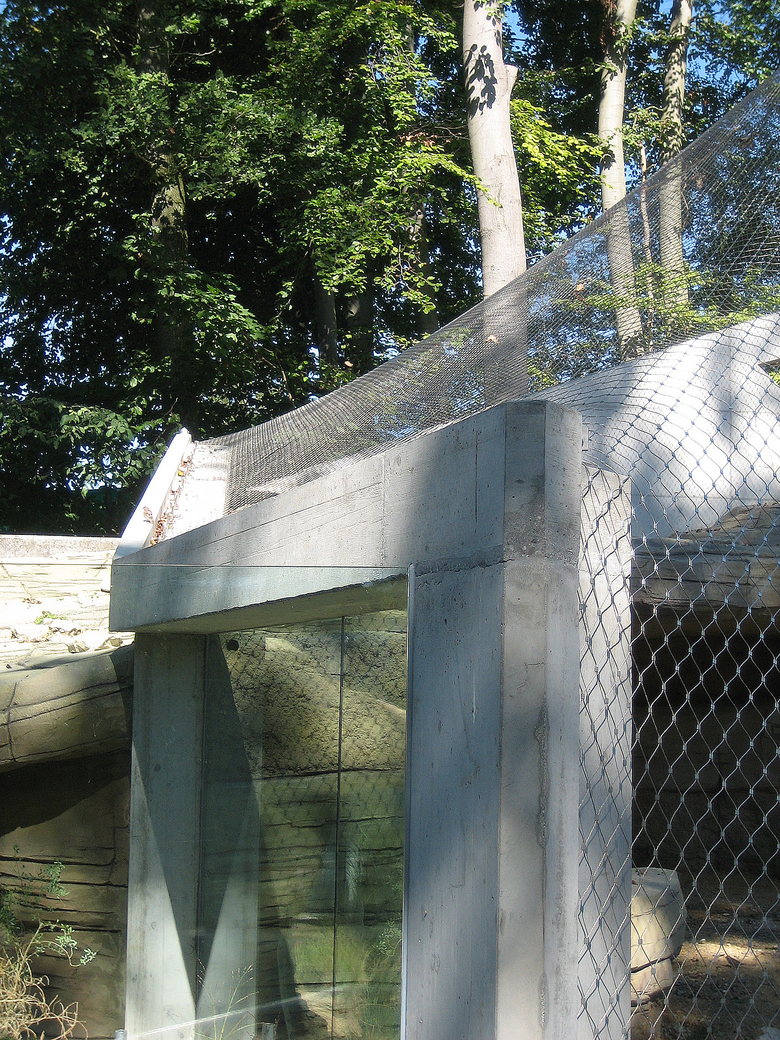 Überdecktes Gehege von rund 600 m2 für Persische Leoparden / Die Struktur des Geheges ist Teil der neu gebildeten Landschaft / Ein das Gehege umfassendes saumartiges Band aus Beton wird im Hintergrund zur Rückwand der künstlichen Landschaft, im Vordergrund zum Dach des verglasten Schaufensters und verankert das textilartige Netz aus Chromstahl am Boden / Das Geflecht wird von fünf, aus dem benachbarten Burgerwald eingeflogenen Eichen getragen und fixiert seinerseits diese Bäume in ihrer Lage / Im variierenden Licht erscheint das Netz wie Nebel über der Landschaft, Spinnweben über Bäumen oder erinnert durch die geschwungene Kontur an die Höhenzüge Persiens.