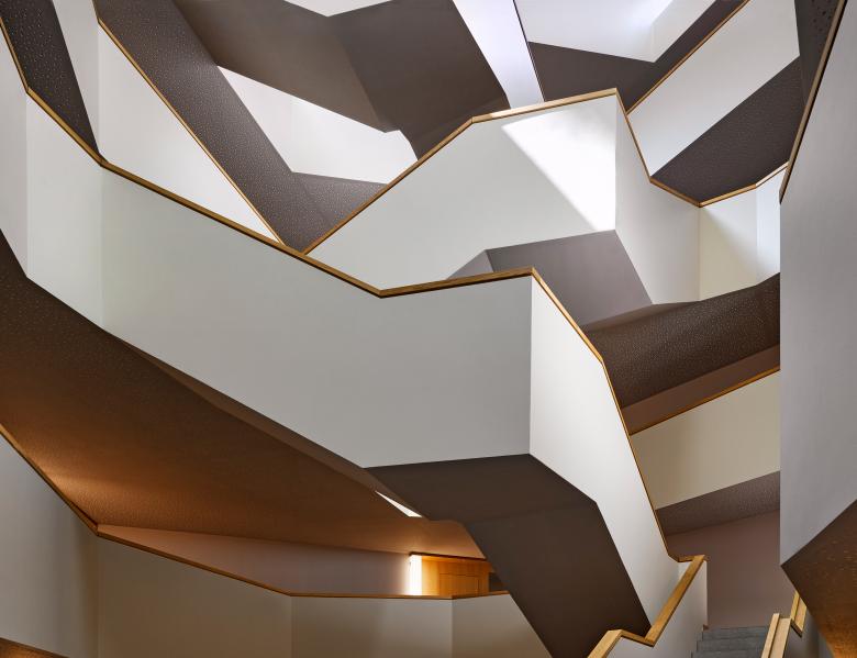 Mehrfamilienhaus mit 22 Eigentumswohnungen / Die unregelmässig fünfeckige Geometrie des Gebäudes entwickelt sich aus der Form der Parzelle und ermöglicht deren optimale Ausnutzung / Die attraktive Treppenanlage in der vertikal belichteten Erschliessungshalle verleiht dem Gebäude eine starke innenräumliche Identität / Alle Wohnungen sind übereck angeordnet und weisen geschlossene Zimmer und offene Wohnbereiche auf / Im Kontrast zum kristallinen und plastisch ausformulierten Binnenraum bestimmt das lichtdurchlässige weich geschwungene Gewebe aus Chromnickelstahl die äussere Erscheinung des Baus mit seinen geschwungenen, erkerartig ausgreifenden Loggien.