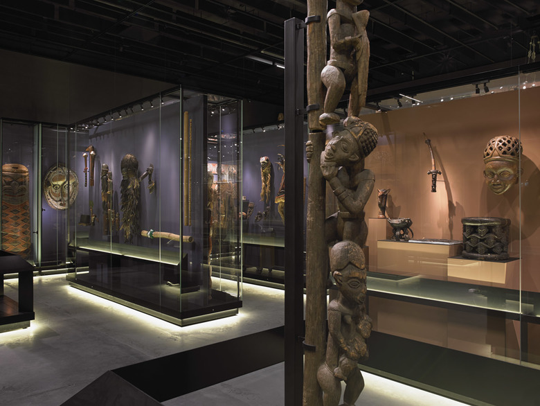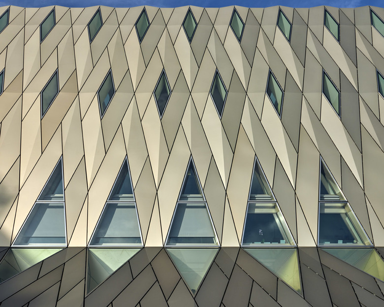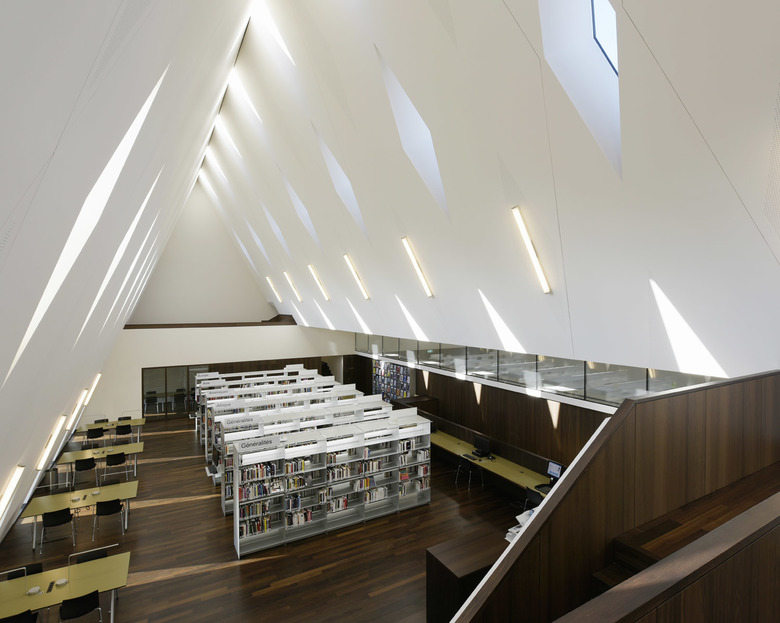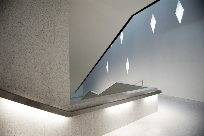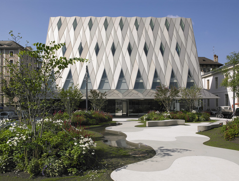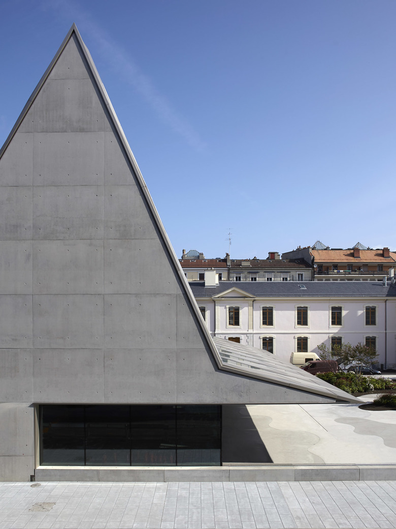 Der oberirdische Teil des neuen Museums hat mit seiner markanten Geometrie eine ikonografische Präsenz im urbanen Kontext / Wie ein Teppich legt sich eine metallene Dachhaut über das aufgeworfene Volumen mit Seitenwänden aus Sichtbeton und evoziert mit seinen rhomboiden Fensteröffnungen Bilder aus der Vergangenheit, als auch Visionen der Zukunft / Der grosszügige Treppenraum verbindet die Mediathek im Dachraum, das Foyer, den Mehrzwecksaal und die Seminarräume mit dem stützenlosen Ausstellungsraum im Untergeschoss / Eingangshalle und Cafeteria im Erdgeschoss sind auf einen vom Strassenniveau leicht erhöhten Platz ausgerichtet