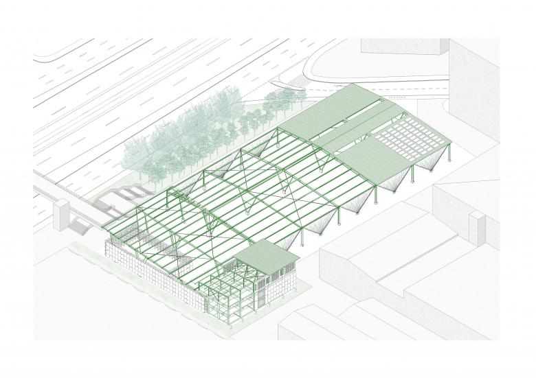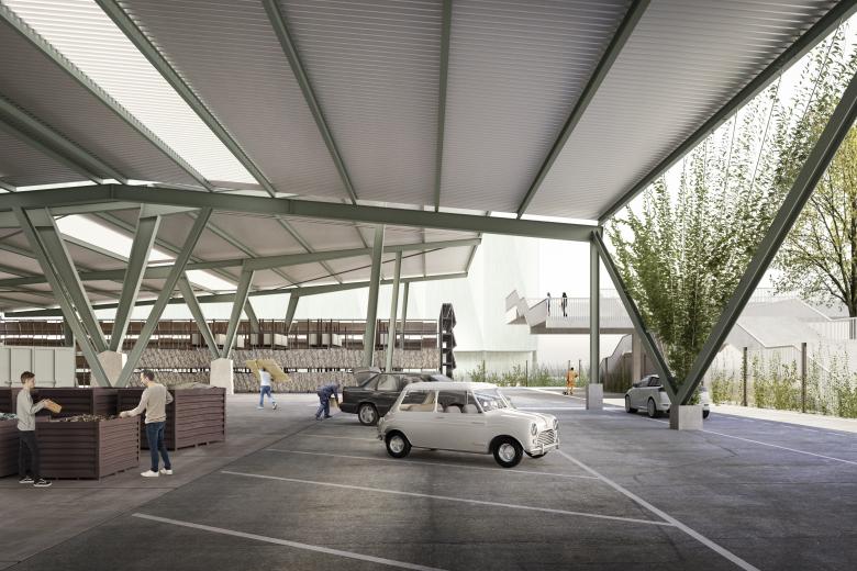Die Gestalt des neuen Recyclinghofes wird massgeblich durch die erkennbar wiederverwendeten Bauteile aus unterschiedlichen Bauteil-Minen bestimmt, welche im Sinne eines Re-Assemblings architektonisch in ein neues Ganzes überführt werden. Die Wandelemente aus rezyklierten Materialien sowie ein vertikaler Pflanzenfilter verleihen der Anlage eine neue architektonische Identi-tät. Wir verstehen das Projekt als Chance, neben erprobten Strategien und Konstruktionen auch neue Wege in der Wiederverwendung von Bauteilen - beispielsweise auf Mass geschnittene Teile aus Ortbeton - einzuschlagen, welche zukünftig als Grundlage für die Weiterentwicklungen ressourcenschonenden Bauens dienen.