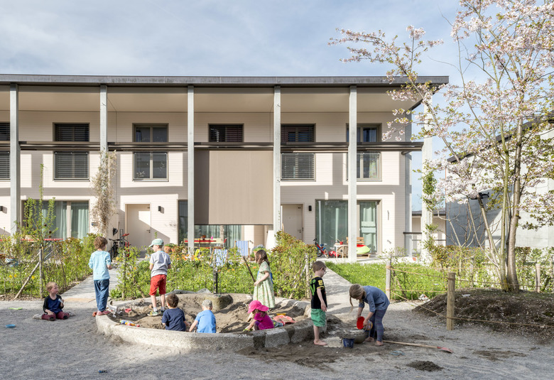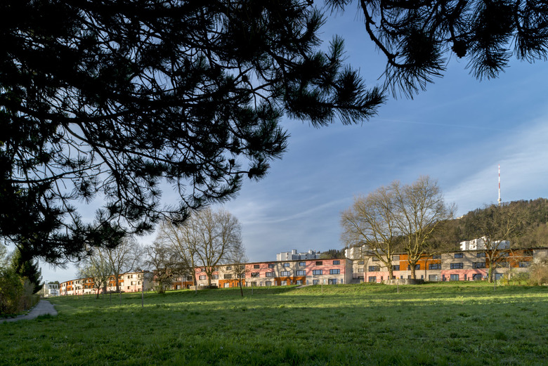 Vier parallel zum Hang verlaufende Bauzeilen bilden Freiräume mit dazwischen-liegenden nahezu horizontalen Freiräumen / Diese dienen als Erschliessungsbe-reich der Wohneinheiten sowie als halböffentliche und private Grünräume / Der unterschiedlich gekrümmte Verlauf der Gebäudezeilen schafft zwei platzähnliche Situationen mit Aufenthalts- und Spielmöglichkeiten / Durch gezielt angeordnete Unterbrüche innerhalb der Zeilen entsteht eine Vernetzung der einzelnen Sied-lungsräume / Gestaffelte Zeilenenden bewirken eine Reduktion der Baumasse und bilden eine Verzahnung mit dem Landschaftsraum.