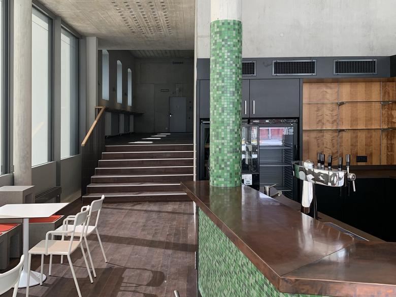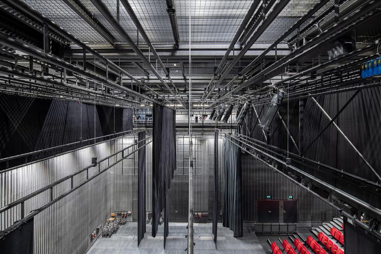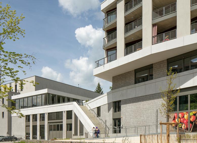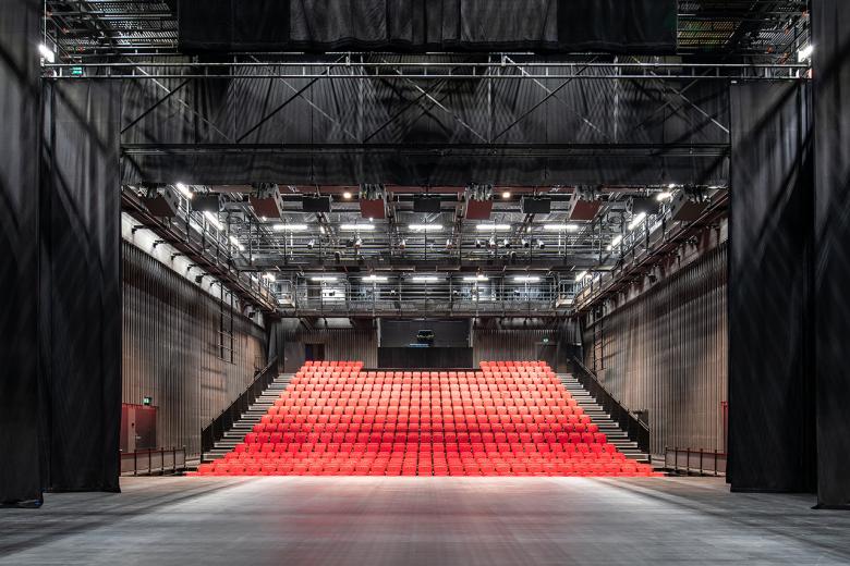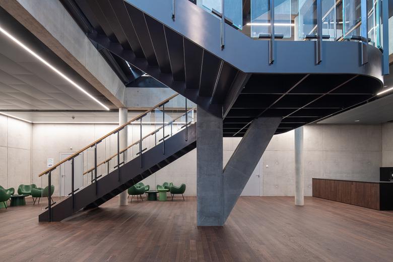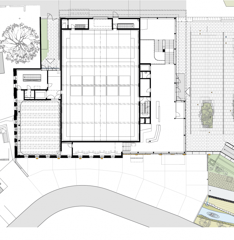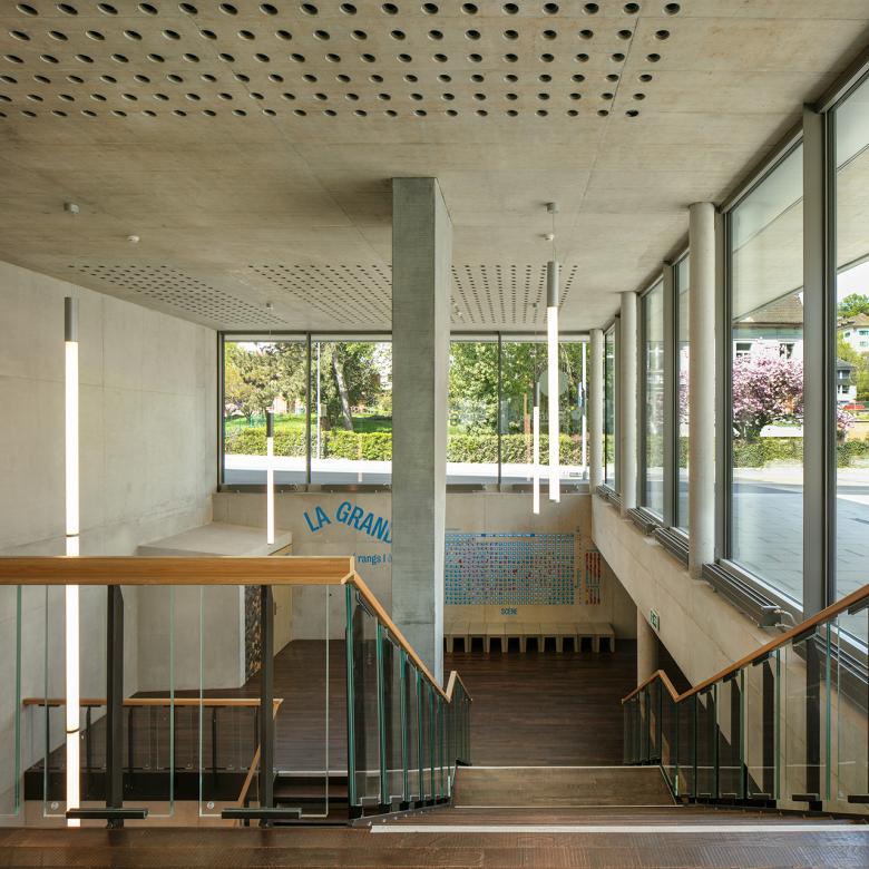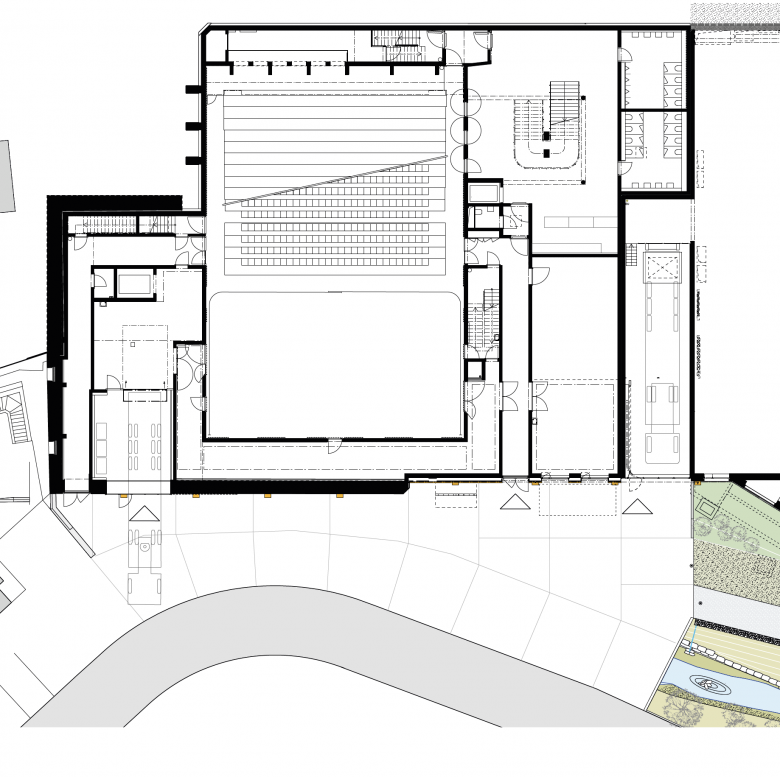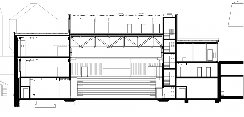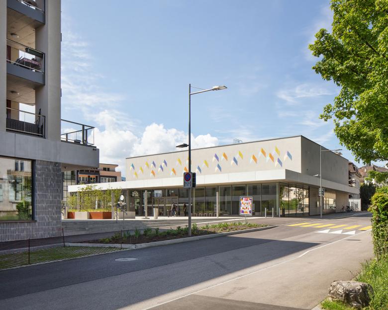 Das neue Jurassische Kantonstheater verknüpft die Überbauung mit der auf der Hügelkuppe gelegenen Altstadt. Es wird als kompakter Baukörper in die bestehende Topografie und hinter die erhaltene Fassade der alten Brauerei eingepasst. Der Publikumseingang erfolgt über die hangseitige Route de Bâle und den neuen Theaterplatz. Die dreiseitig verglaste Eingangshalle fungiert als Erweiterung des Stadtraumes in Richtung vom Foyer, das sich kaskadenartig rund um die Haupttreppe nach unten über zwei weiteren Ebenen entwickelt. Diese Geschosse ermöglichen den Zugang zum grossen Saal, auf Höhe der oberen, bzw. der unteren Ebene der Teleskoptribüne. Diese lässt sich nach Bedarf nach hinten in eine Wandnische einfahren und macht aus dem bestuhlten Theatersaal für 450 Zuschauer einen ebenerdigen Veranstaltungsraum für 840 Besucher. Dem Black- box-Konzept entsprechend ist die gesamte Theatertechnik über eine vollflächig begehbare Gitterdecke frei bespielbar. Die Saal-Akustik ist primär über die Wandoberflächen aus Wellbeton gewährleistet. Bewegliche Vorhangsflächen sowie Reflektionspaneele ermöglichen die Feineinstellung auf die Bedürfnisse der einzelnen Veranstaltungen. Die Bühne und ihre Nebenbereiche werden stufenlos über die untere Rue de la Brasserie angeliefert. Das gesamte Gebäudekonzept entwickelt sich aus den topografischen Verhältnissen und prägt die dicht bebaute Hügelflanke der Altstadt.