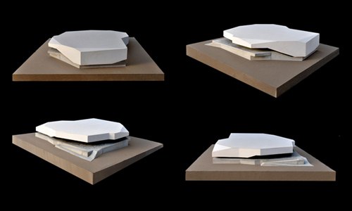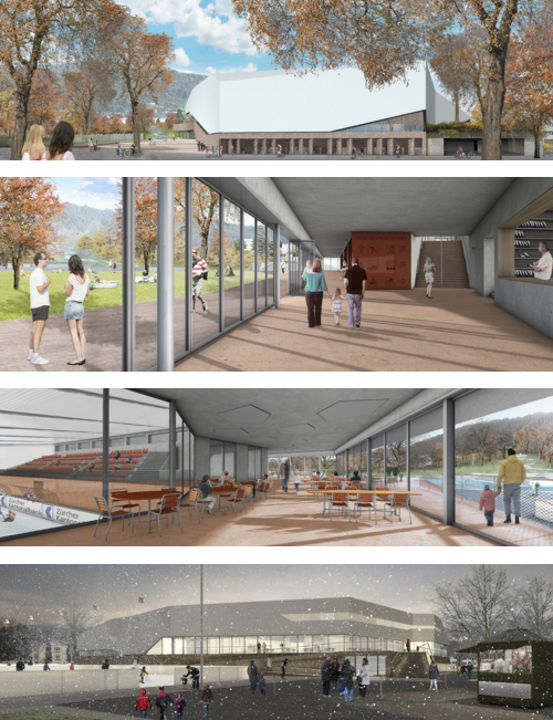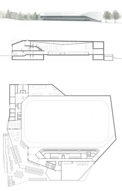 Eingebettet im Strassenraster am Fusse des Üetlibergs, zeichnet sich das neue Sportzentrum Heuried durch seine  gebrochenen Kanten und seinen geknickten Fassadenverlauf aus. Ähnlich einer abgedrifteten Eisscholle ruht der weiss schimmernde Baukörper auf einem als Felsplatte ausgebildeten Sockel. Ausschlaggebend für die Formgebung des Volumens ist jedoch weniger die Analogie zum dahinschmelzenden Eisblock als der Anspruch, den Neubau präzise in das Kräftefeld der Parkanlage einzupassen. Es gilt tatsächlich, den Baumbestand zu schonen, die nutzbare Freifläche zu vergrössern, die Sichtbezüge zu wahren, die funktionalen Zusammenhänge zu optimieren und die Wegführung prägnant zu gestalten; nicht zuletzt trägt die gebrochene Geometrie auch zur Integration der Baumasse in die Massstäblichkeit des Quartiers bei. Obwohl die rechteckige Eishalle als Hauptraum über 60% des Volumens ausmacht, tritt sie äusserlich nicht als solche in Erscheinung: vielmehr bestimmt die Funktion des Gebäudes als Drehscheibe zwischen Strasse und Park, zwischen innen und aussen, zwischen Sommer- und Winternutzungen den Ausdruck des Neubaus.