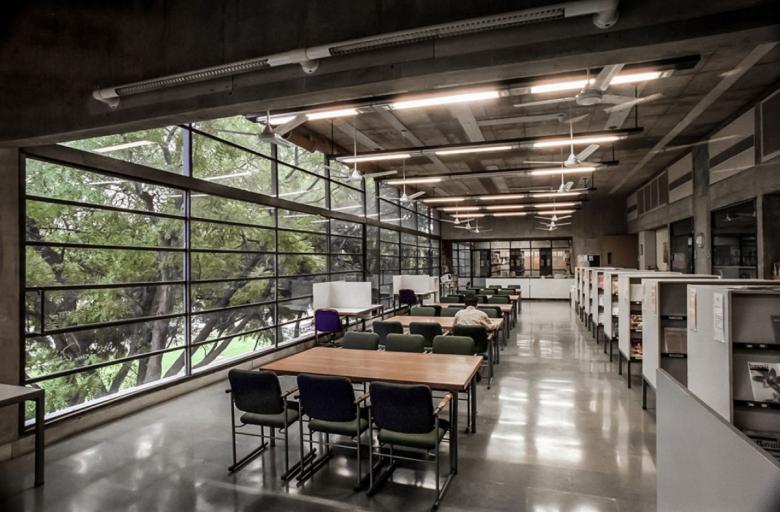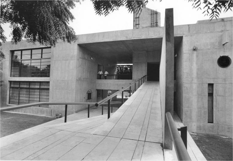 In response to the client’s brief and the row of 8 existing shady Neem trees on the site; the building is conceived as a linear, 2-storeyed, cast in-situ exposed concrete structure aligned parallel to the trees. A pedestrian promenade traverses under the trees and leads to the ceremonial, double height foyer which provides access to the classrooms, seminar halls, boardroom and bookshop on the ground floor. It also connects to the processional ramp leading to the first floor where a library, an exhibition space and a 250-seat auditorium are housed. The large glazed openings of the building enable even and deeper penetration of daylight, enhance the transparency of the building and extend the vistas across the site. They also provide a subtle contrast to the monolithic grey concrete.