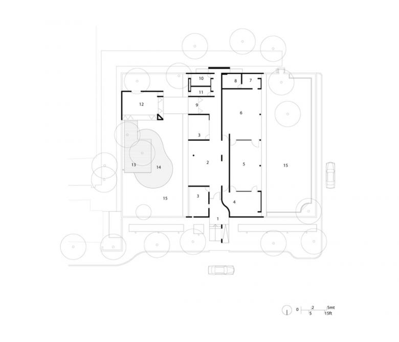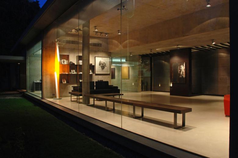 The entrance abuts the road and the piano wall beckons the visitors in. The studio is an independent, rectangular, single storey structure located in a garden. Adjoining the main studio is a pavilion used primarily as an informal meeting area. The major consideration in the design was to blend the relationship of the interior and exterior, so as not to distinguish the office spaces and the landscaped garden but bring them together in a unity, complete and whole that is indivisible. The building is built in concrete and the fair-face surface also contributes greatly as a design feature.