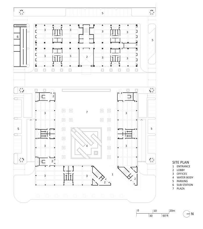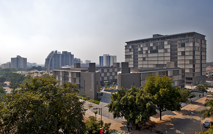 Safal Profitaire provides a built-up area of 30,000 sq. m. The project comprises of one high-rise and three low-rise multi-tenanted office buildings embracing a courtyard. A distinguishing feature of the project is the vertically pivoted louvers to control glare, modulate the daylight and views and also provide surface articulation.