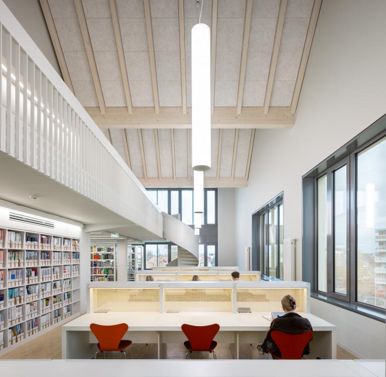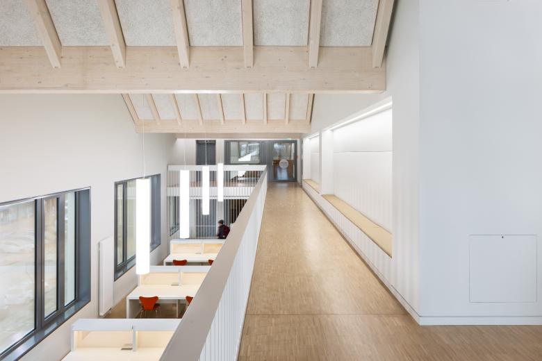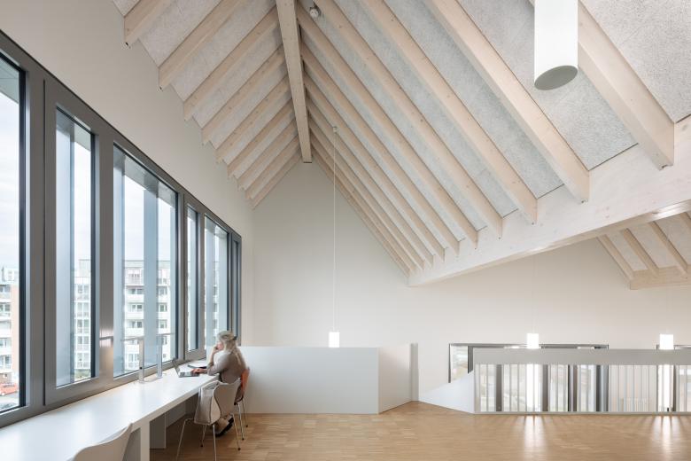 Unter der Dachlandschaft befindet sich der zweigeschossige Lesesaal mit Galerie und Bücherwand – ein besonderer, identifikationstiftender Raum.