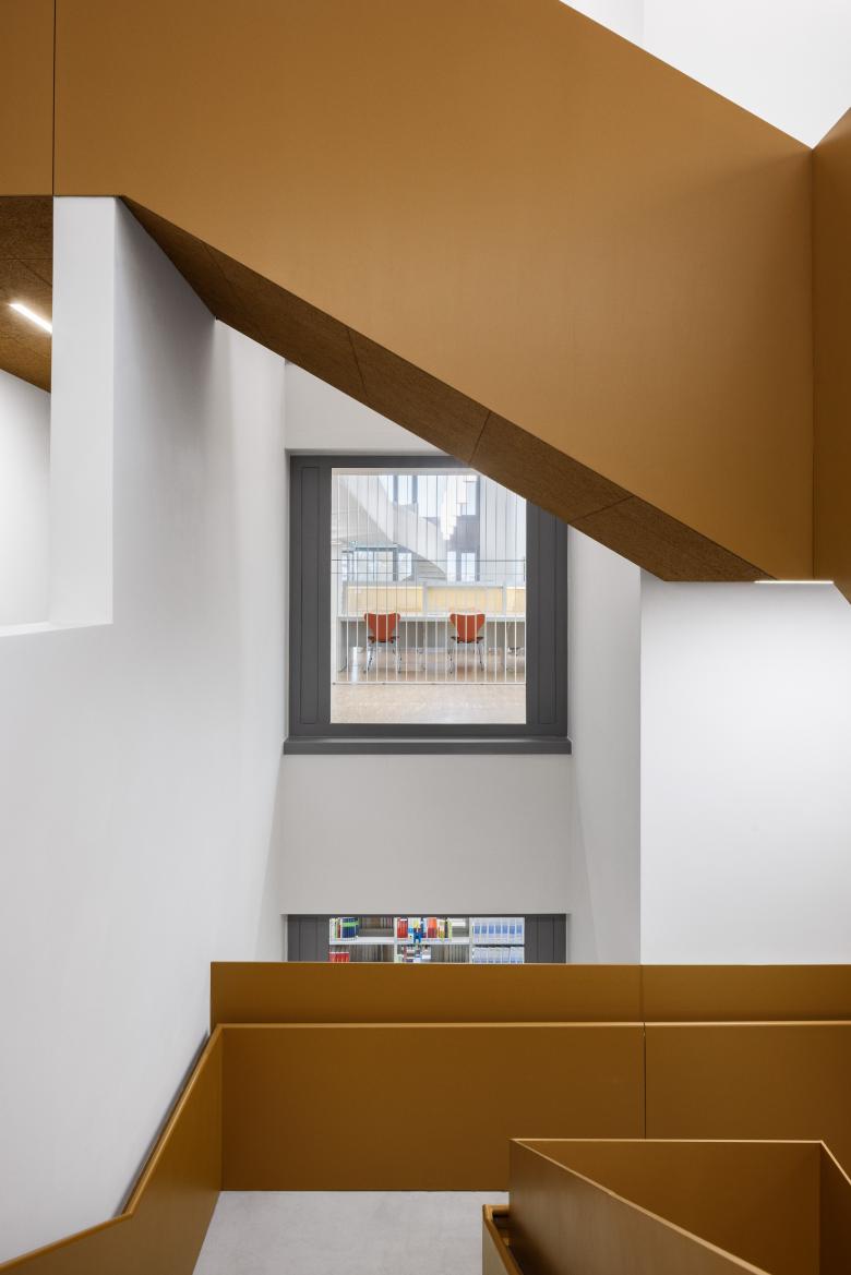 Der viergeschossige Erweiterungsneubau schließt direkt an die Bestandsbauteile an und wird mit diesen über Wege- und Blickbezüge verbunden. Die Hierarchisierung der Nutzungen erfolgt entsprechend der zu erwartenden Nutzungsintensität von „offen nach intern“ bzw. von „Kommunikation nach Konzentration“.