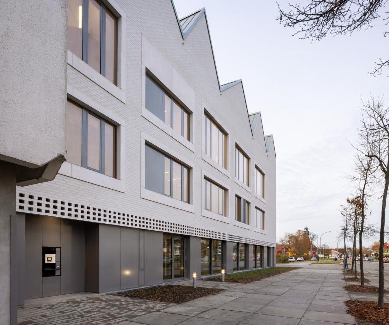 Die Fassadengestalt folgt der inneren Struktur der Bibliothek. Das aus dem Bestand übernommene Tragraster, sowie das darin enthaltene Ausbauraster der Regalstellung, zeichnen sich in der Fassade sowie den großen Fensteröffnungen und ihren Teilungen ab.