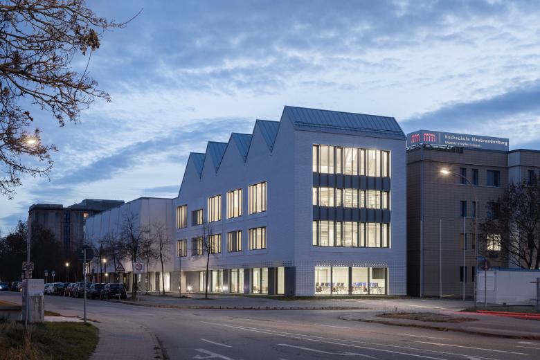 Der Materialkanon aus den bestehenden Hochschulgebäuden wird aufgenommen und modifiziert. Entsprechend bekleiden die tragenden Außenfassaden Ziegelsteinen bekleidet mit hell geschlämmten Oberflächen. Die Fassadenöffnungen erhalten dagegen glatt geputzte Umrahmungen und Aluminiumfenster mit feststehendem Sonnenschutz aus mandarinfarbenem Metallgewebe im Scheibenzwischenraum.