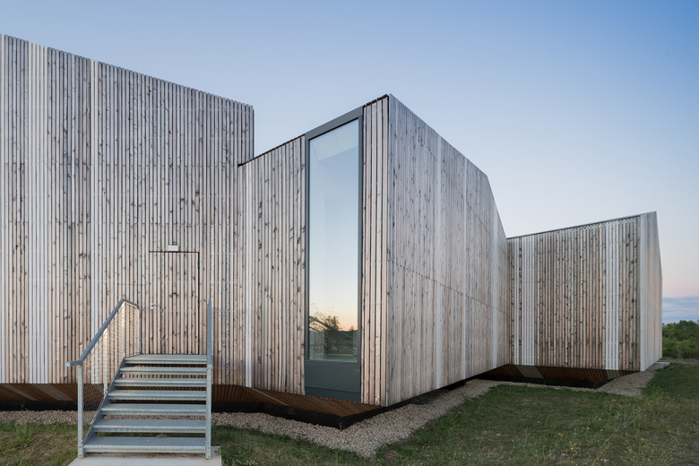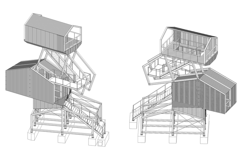 With the exception of the observatory, which is a steel construction, the collection of pavilions and small "follies" is based on a modular wood system, repeating and combining different sized and angled timber frames. This approach allowed for interesting and unusual constructions, enabling a wide range of possible variations with a very limited number of elements. At the same time the relatively low priced construction method enabled the integration of local building know how and local companies.