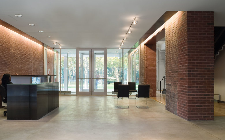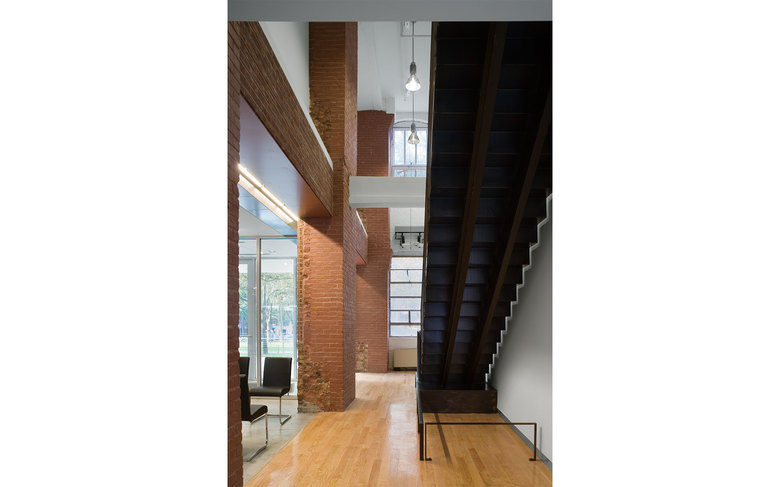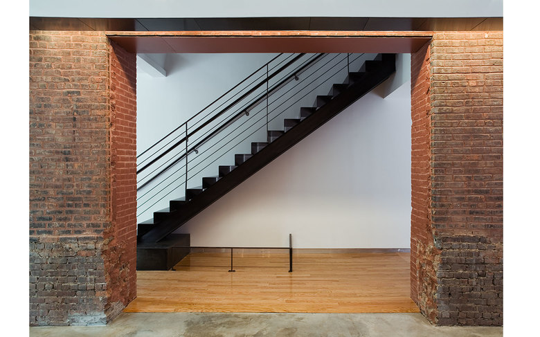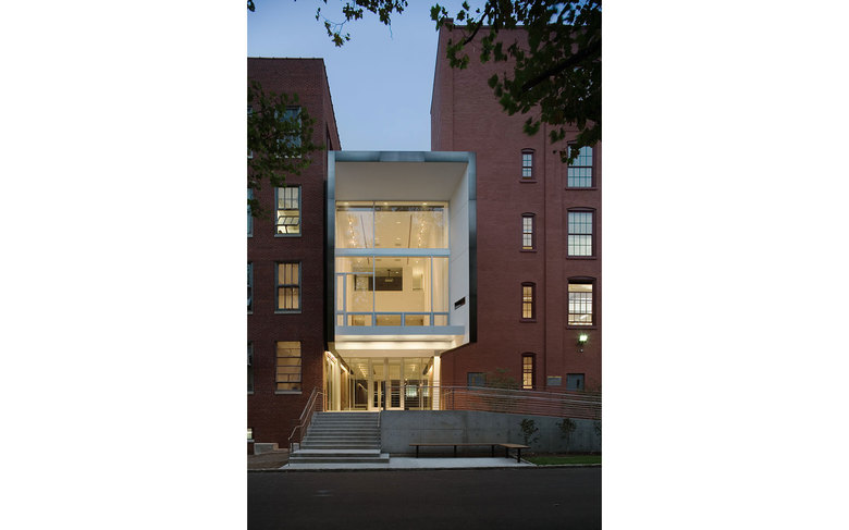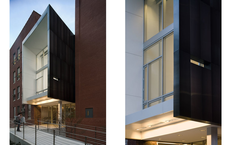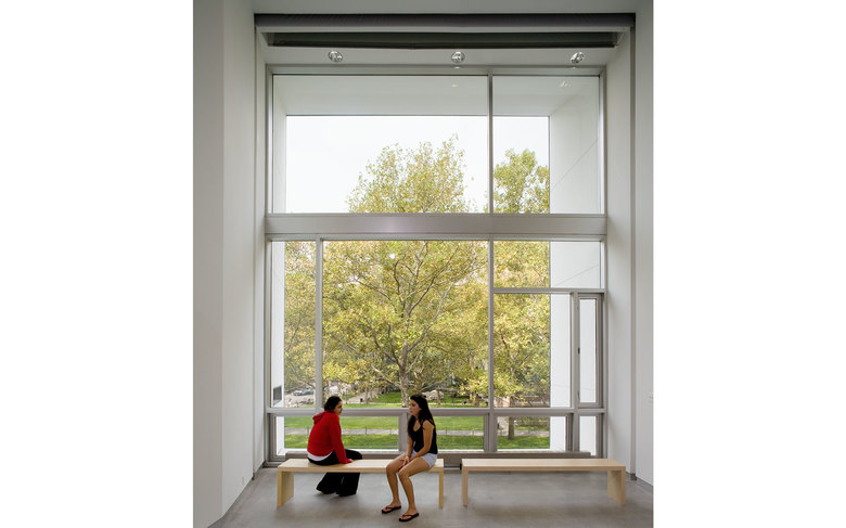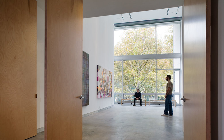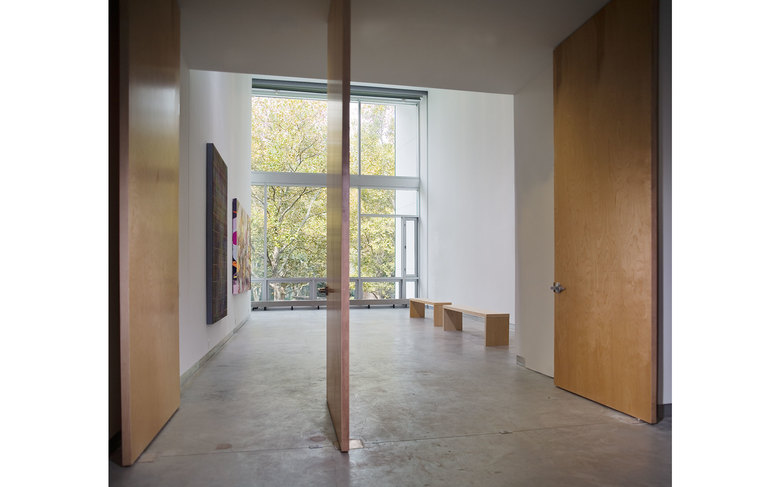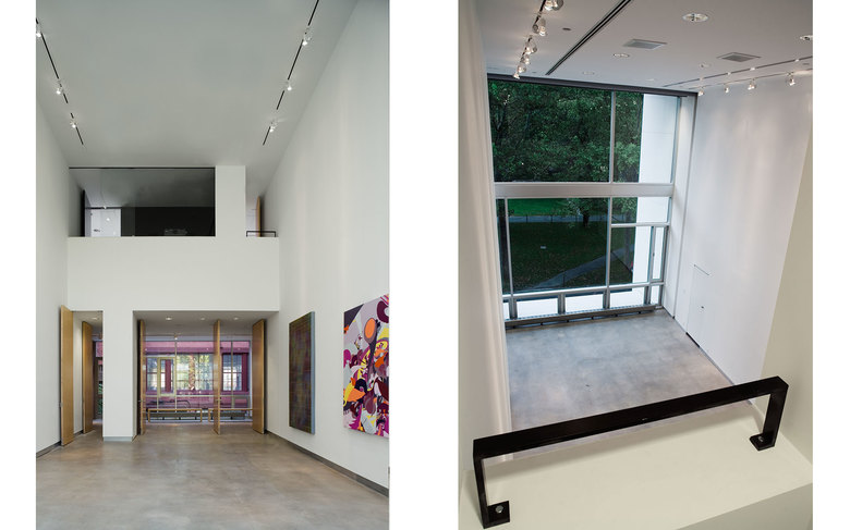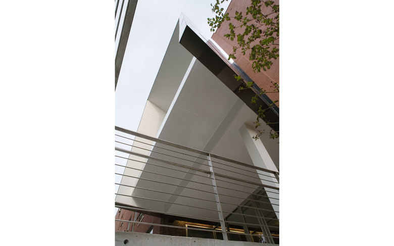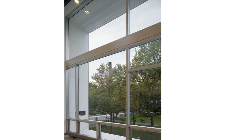 The Pavilion is clad with hand-finished stainless steel panels by Milgo Bufkin steel fabricators. The front façade faces north, toward the main Institute quadrangle and is all glass, with screens that pull down for rear projection to the campus, or to fully darken the space for showing slides or videos. The Pavilion will be mainly used as a gallery and for Institute receptions. To the south the Pavilion bridge ramps east and west creating a circulation zone that connects Pratt Pavilion, Steuben, and Pratt Studios. The bridge overlooks the new central courtyard.