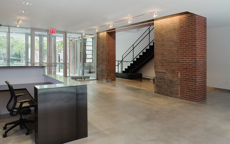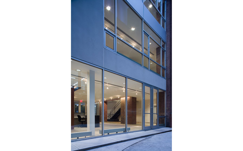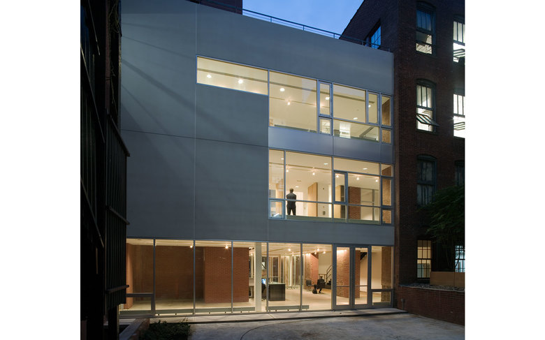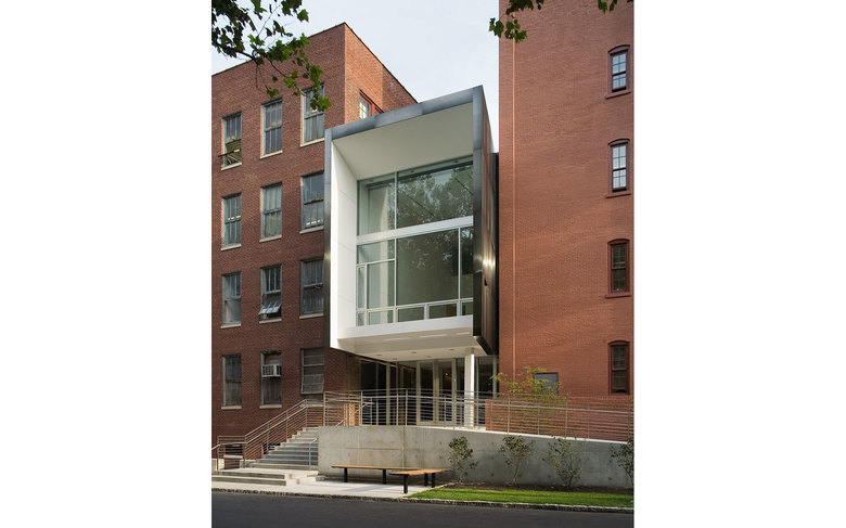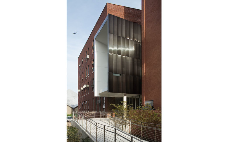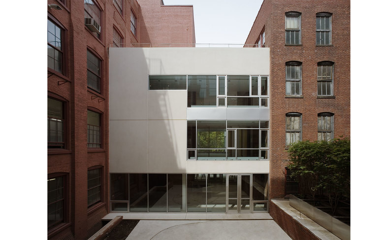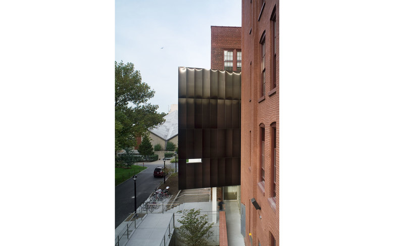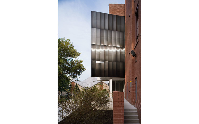 The Juliana Curran Terian Pratt Pavilion is a new focal point for the Pratt Institute campus in Brooklyn, New York. The Pavilion will be used by Pratt students and faculty to showcase work from the Institute’s various arts programs. Clad with stainless steel, and suspended between two existing industrial loft buildings on the main Pratt Institute campus in Brooklyn, New York, the project includes a glass entry area for the Pavilion and its neighbors, Steuben Hall and Pratt Studios. The new Design Center created by joining all three buildings houses 200,000 square feet of Institute programs. The overall new construction for the Pavilion and its auxiliary areas including the glass entrance and a new circulation bridge to the south, comprise 10,000 square feet. Behind the Pavilion, a new courtyard makes an outdoor room for informal meetings and classes in warm weather.