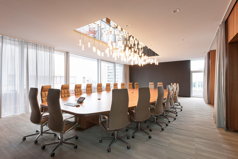 In entgegengesetzter Richtung zur Rippendecke hängen feine Lichtprofile im Raum und bringen blendfreies, weiches Licht in den Raum. Modular aufgebaut, aus mikroprismatischem Kunstglas hergestellt und mit hocheffizienten Energiewerten unterstützen sie subtil die Bürowelt. Zusätzlich eingesetzte Arbeitsplatzleuchten lassen sich individuell steuern.